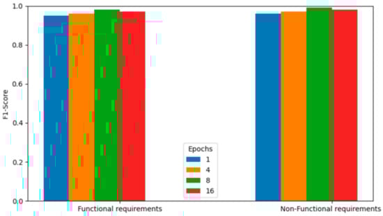 Figure 4 illustrates the performance trends across different epoch settings. For FRs, the F1-score ranged from 0.96 to 0.99, showing a gradual improvement up to 8 epochs, after which performance slightly declined. A similar pattern was observed for NFRs, with F1-scores also ranging between 0.96 and 0.99, peaking at 8 epochs before experiencing a minor drop. These results suggest that 8 epochs represent an optimal training duration for this task, beyond which the model may begin to overfit.