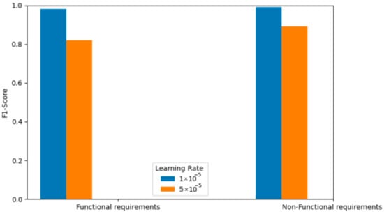 In our experiments, we evaluated two learning rate settings: a lower rate of 1 × 10−5 and a higher rate of 5 × 10−5. As illustrated in Figure 6, the lower learning rate consistently yielded higher F1-scores across all requirement classes for both the PROMISE and FR_NFR datasets. These results suggest that a more conservative learning rate allows the model to fine-tune more precisely, especially on smaller datasets.