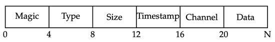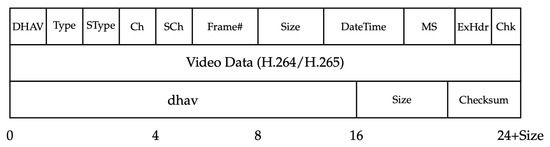 Hikvision systems utilize a custom frame format with a binary structure consisting of several components at fixed byte offsets. The frame begins with a magic number (0x484B5649) at offset 0, occupying 4 bytes. This is followed by a frame type identifier (1 byte) at offset 4, frame size as a 32-bit little-endian unsigned integer at offset 8, timestamp as a 32-bit little-endian unsigned integer at offset 12, channel identifier (1 byte) at offset 16, and finally the actual video data payload starting at offset 20. The payload length equals the frame size minus 24 bytes of header overhead, as illustrated in Figure 2.