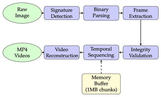 The architecture consists of five primary modules: (1) a Signature Detection Module for automated manufacturer identification, (2) Manufacturer-specific Parsers for binary data interpretation, (3) a Frame Extraction Engine for video data recovery, (4) a Temporal Sequencing Algorithm for chronological reconstruction, and (5) a Video Conversion Module for forensically sound output generation.
