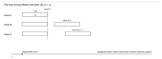 . This approach decorrelates transmission start times while preserving controlled concurrency necessary for capture effect exploitation and quasi-orthogonal reception.