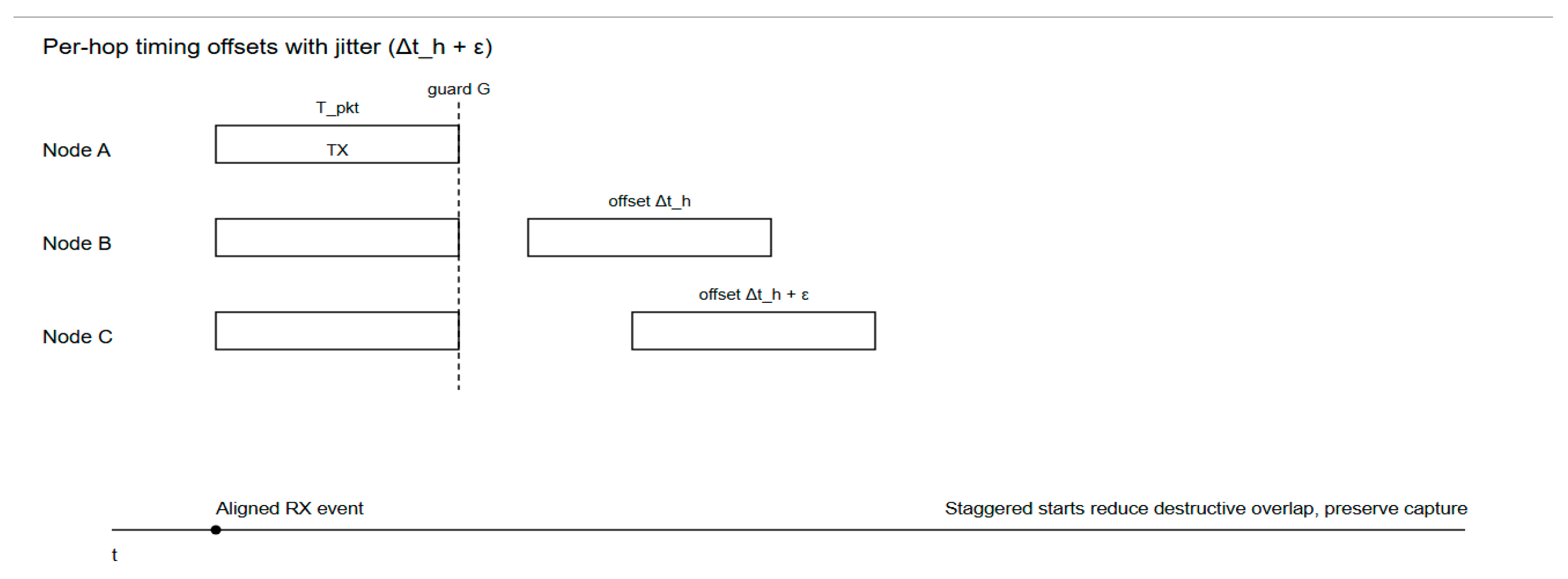 - Sync word alignment: For concurrent transmissions to be detectable as the same network, their sync words must align within approximately symbols. Our timing offset policy ensures relay nodes forwarding the same packet maintain sync word coherence by scheduling transmissions relative to a common reference , where is the guard time.