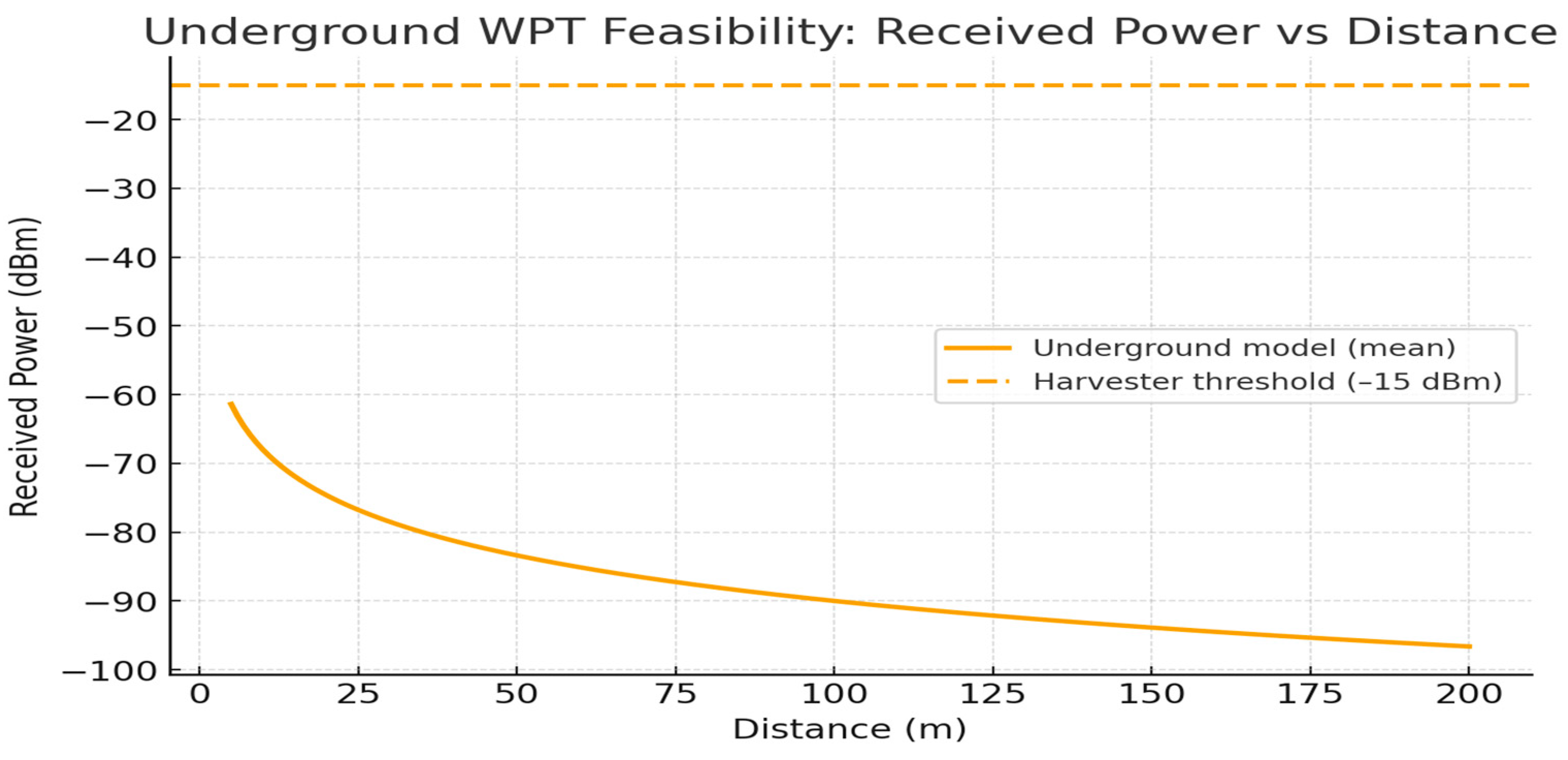 - Disaster-resilient mesh topology with far-field RF-WPT integration: We demonstrate practical long-range wireless power transfer up to 35 m in operational underground mine conditions using dual-antenna separation, external power amplification, and supercapacitor storage. We characterize energy storage trade-offs and self-discharge behavior under harsh tunnel propagation, addressing a critical gap in existing LoRa concurrent transmission literature which rarely validates far-field WPT in underground environments.