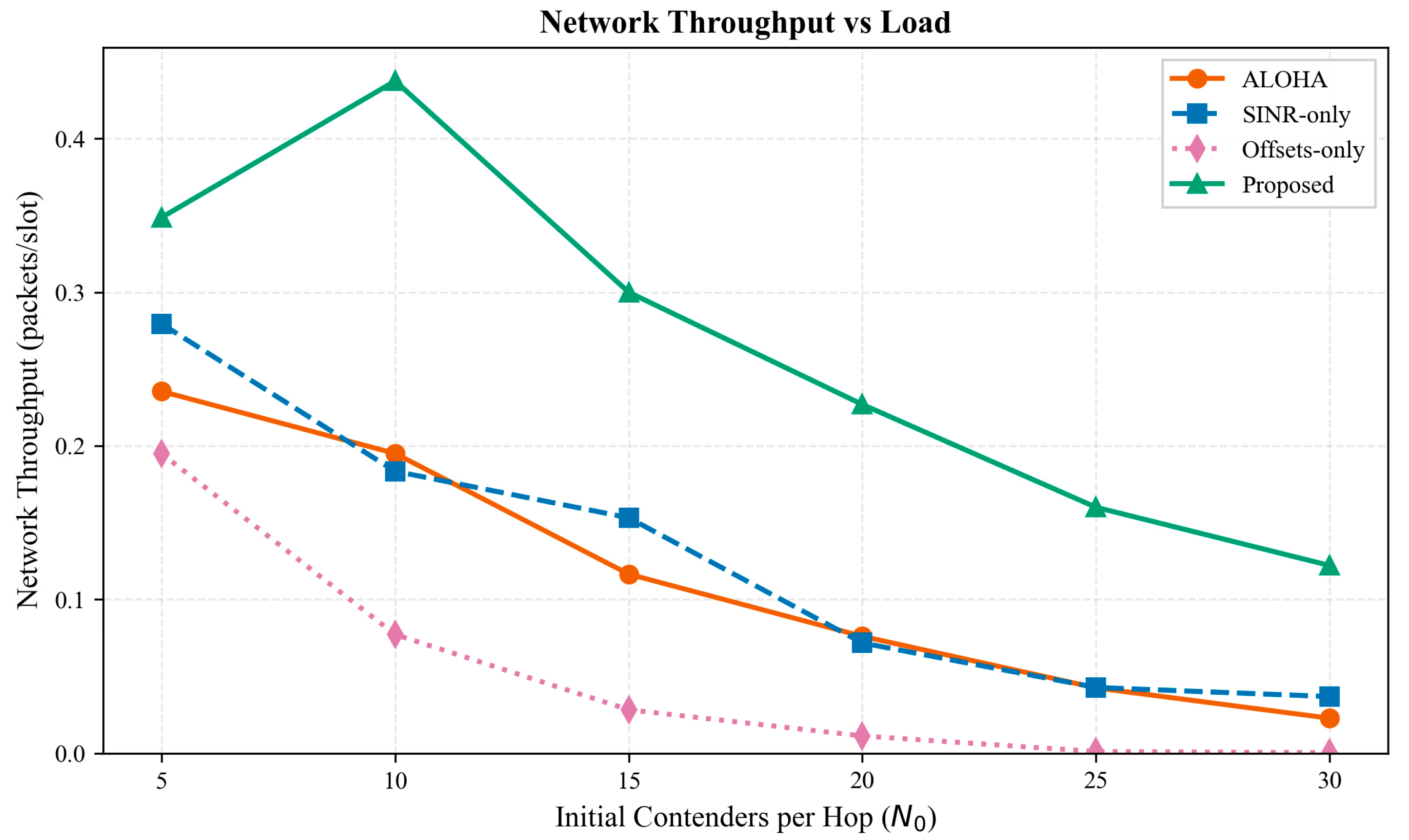 - Mathematically derived timing offset scheduler: We formulate optimal per-hop timing offsets through Poisson collision modeling that deliberately staggers transmissions to exploit LoRa’s capture effect and imperfect inter-spreading-factor orthogonality while maintaining sync word coherence. This decentralized approach requires no tight synchronization or centralized coordination, critical when infrastructure is damaged during emergencies.