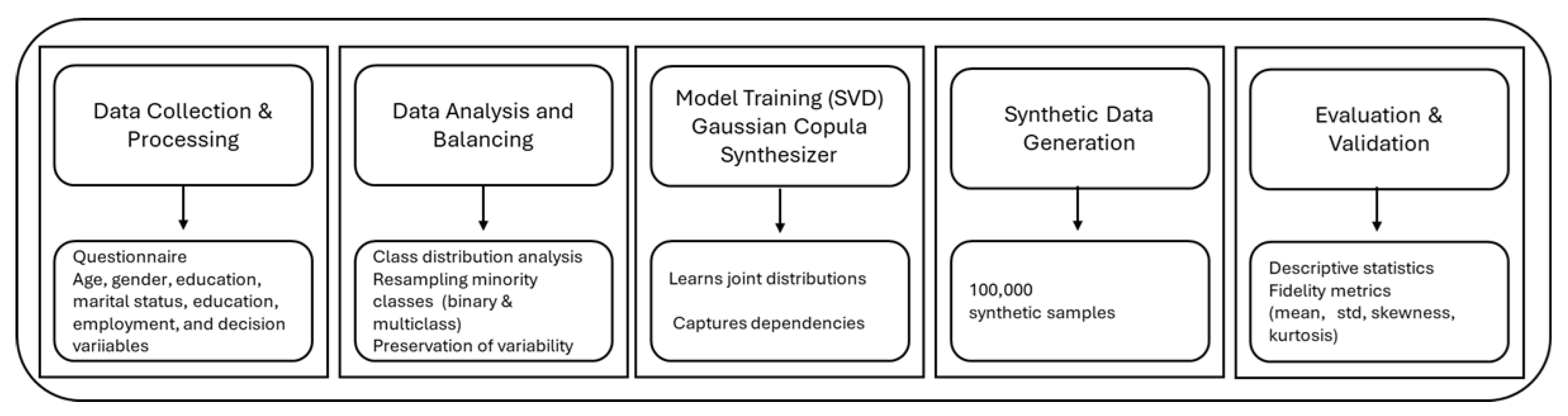 6]. Within the SDV framework, the GaussianCopulaSynthesizer was selected over CopulaGAN due to its stronger statistical grounding, greater transparency, and lower computational complexity [