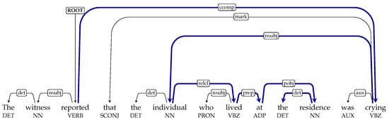 Example of calculating the tree depth of “The witness reported that the individual who lived at the residence was crying”. For this sentence, the max depth is 6. Tracing the arrows, starting from the root word “reported”, each arrow indicates one additional level of depth. The black arrows indicate general dependency relations, while the blue arrows trace the longest dependency path used to compute the maximum depth of 6.