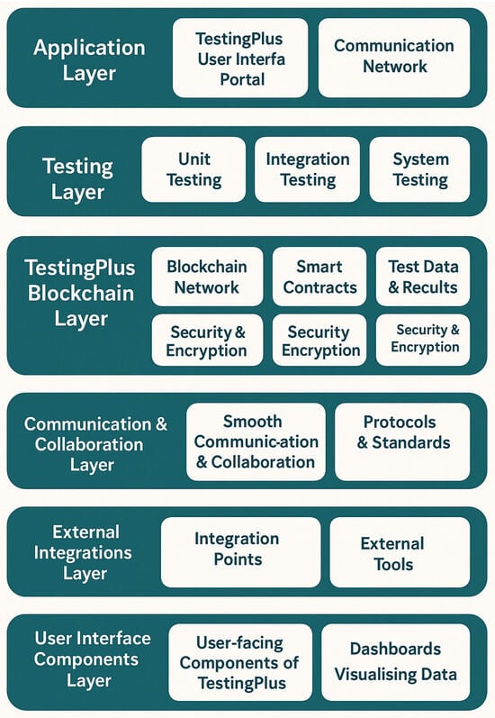 One of the research projects highlights the benefits of transparency, traceability, and efficient collaboration in OSSAP, demonstrating the significance of a clearly defined workflow. By incorporating blockchain technology, OSSAPTestingPlus improves these features, making it possible for all parties involved in the testing process to view and verify records of all activity. Figure 4 shows and explains the OSSAPTestingPlus Blockchain Layered Architecture.