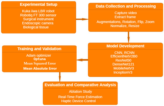 The methodology for the CNN-based force prediction study consists of five main stages: the setup of a controlled environment to capture force measurements and images; data collection and processing; model development to analyze the data and predict the force; training and validation to increase the model’s performance; evaluation, assessing the model’s accuracy and efficiency against other approaches to demonstrate its effectiveness (Figure 1).