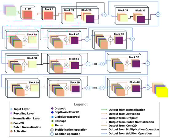 The proposed model, displayed in Figure 3, incorporates most of the layers usually met in the EfficientNet family such as Conv2D, BatchNormalization and GlobalAverage-Pooling2D, and a complex variation in DepthwiseConv2D, Squeeze-and-Excite (SE) Blocks, Dropout, Add and Dense layers. No additional Dropout layers were manually introduced beyond those embedded within the pretrained EfficientNetV2B0 backbone.