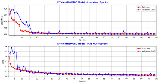 Based on the training and validation results (Figure 4 and Figure 5), the CNN model outperformed the RCNN in terms of both accuracy and efficiency under identical training conditions. The blue lines in Figure 4 and Figure 5 represent the training loss and training MAE, both of which decrease steadily over the epochs indicating consistent improvement on the training data. The red lines represent the validation loss and validation MAE, which fluctuate significantly and remain higher, showing more variability and challenges in performance on the validation set.