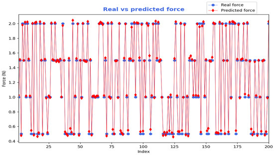 The model’s performance was evaluated on the test dataset, achieving a loss (MSE) of 0.0013 N2 and a MAE of 0.0290 N. This indicates that, on average, the predicted force values deviated from the actual measured forces by approximately 0.0290 N. These metrics illustrate the model’s accuracy in calculating applied forces only from visual data derived from pictures depicting an esophagectomy intervention using biological tissue. Based on the 1937 images from the testing phase, Figure 6 shows the predicted force, using EfficientNetV2B0 model, compared with the real force for a randomly selected subset of 200 images. The predicted forces (red) closely follow the overall trend of the real forces (blue). Most red markers lie very close to the blue ones, particularly at higher force levels, indicating a high overall estimation accuracy.