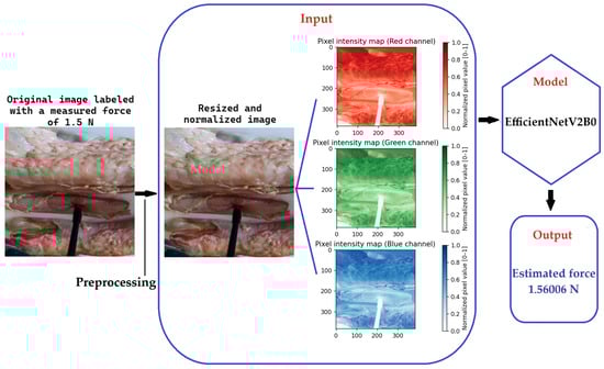 To illustrate the prediction process in a concrete and transparent manner, Figure 7 presents the full sequence of steps involved in estimating the applied force from a single image of the test set, labeled with a ground-truth force of 1.5 N. The original RGB image is first subjected to a preprocessing pipeline, which includes resizing to 384 × 384 pixels and pixel-value normalization to the range [0, 1], producing a three-dimensional numerical array of size (384, 384, 3). Each element of this array represents the normalized intensity of one of the three chromatic channels (red, green, and blue), that encode the visual texture and color information relevant to tissue deformation. The three colors intensity maps extracted from the image are individually visualized in Figure 7 to emphasize the spatial features preserved in each channel. These normalized maps are then stacked and fed as input to the EfficientNetV2B0 convolutional neural network, which processes them through successive convolutional and non-linear layers to extract hierarchical visual patterns associated with the applied force. Based on these learned visual features, the model outputs a continuous scalar value corresponding to the estimated force, which in this specific example is 1.56006 N. The close agreement between the measured and estimated force demonstrates the model’s ability to infer subtle physical interactions directly from visual data.