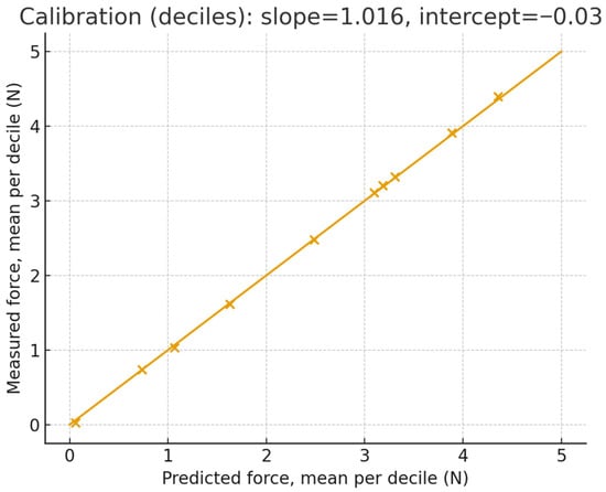 Figure 4 illustrates the evolution of the CNN model over 100 epochs. The training loss started around 0.22 and decreased relatively steadily to approximately 0.0008, indicating that the model learned the relationship between the input and output data effectively. The validation loss began at a higher value, but decreased rapidly during the first 16 epochs, reaching values similar to the training loss. After around epoch 16, the validation loss fluctuated slightly but generally remained close to the training loss, reaching a minimum of 0.0004 by epoch 100. The training MAE decreased from approximately 0.5 N to 0.2 N, reflecting a significant improvement in prediction accuracy. The validation MAE started at a higher value (approximately 0.58 N) but gradually decreased, reaching a minimum of 0.017 N by epoch 100. The model was trained efficiently, minimizing errors on both the training and validation sets. The lack of a significant divergence between training and validation loss suggests that overfitting did not occur. The very low MAE on the validation data indicates good generalization and consistent predictions. Training stability was also evident, with no sudden spikes or large oscillations in loss, implying that the optimizer and learning rate were well-chosen. After epoch 20, both loss and MAE stabilized at low values, indicating correct convergence. Overall, the CNN model is well-trained and demonstrates strong generalization capability. The low and closely aligned training and validation errors, along with the performance metrics (MSE = 0.0004 N2, MAE = 0.017 N), indicate precise and robust predictions.