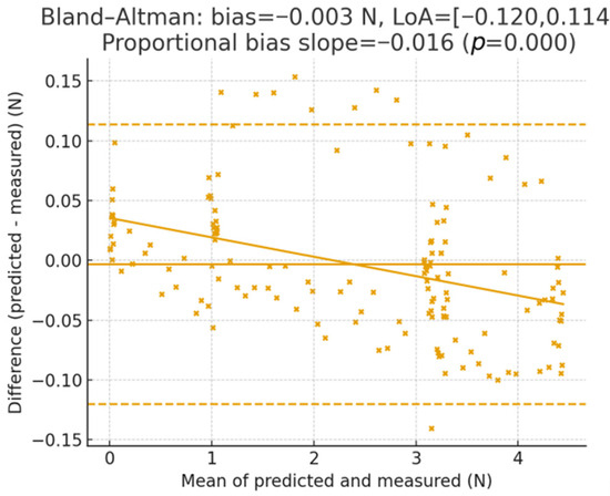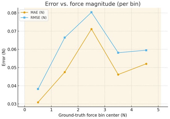 The results, presented in Table 2, highlight the superior performance of the Efficient-NetV2B0 model in terms of both accuracy and computational efficiency. It achieved the lowest MAE of 0.017 N and a Root Mean Squared Error (RMSE) of 0.0207 N, outperforming ResNet50 (MAE = 0.0235 N) and DenseNet121 (MAE = 0.0193 N). While InceptionV3 exhibited comparable MAE and RMSE values, it required significantly higher inference time (31.72 ms) and GPU memory (11,821 MB).