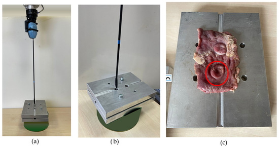 To enhance the procedure safety, a system to notify the surgeon when the force applied to the tissue exceeds a certain limit was developed. It triggers an alarm when the tissue is at risk of damage due to the excessive applied force. To determine the appropriate force thresholds for the system, esophageal tissue samples were subjected to stress testing and puncturing by applying increasing force until the rupture of the tissue. The experimental setup, presented in Figure 16, involved fixing esophageal tissue between two aluminum plates, each containing a hole through which the surgical instrument was inserted Figure 16b, applying force onto the tissue as can be seen in Figure 16c.
