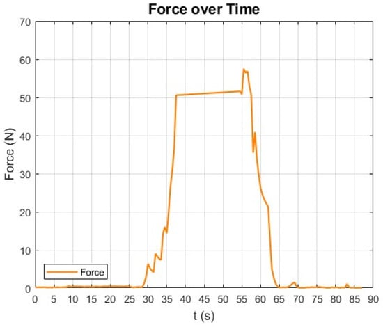 Force application profile during tissue stress test—applied force rises steadily, peaking at 57 N before rapid decline, indicating tissue rupture point.