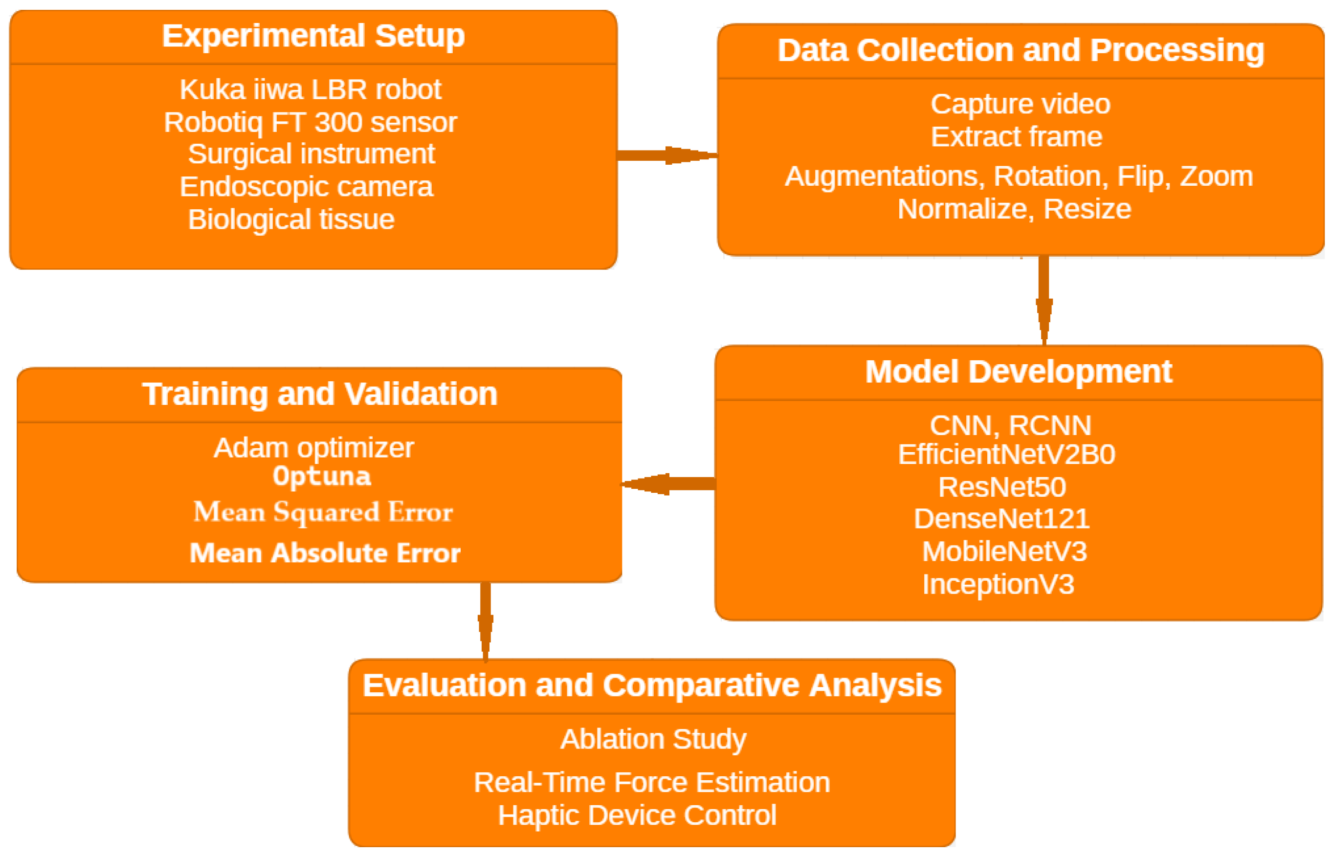 The methodology for the CNN-based force prediction study consists of five main stages: the setup of a controlled environment to capture force measurements and images; data collection and processing; model development to analyze the data and predict the force; training and validation to increase the model’s performance; evaluation, assessing the model’s accuracy and efficiency against other approaches to demonstrate its effectiveness (