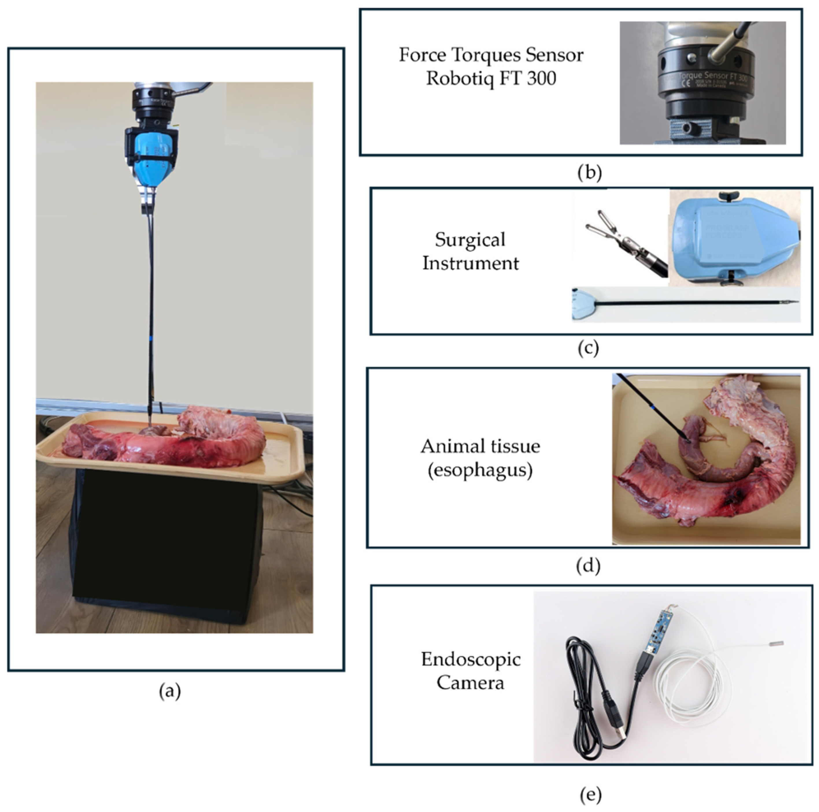 To gather the necessary training data, a series of 40 videos was recorded capturing tissue responses at various force levels between 0 and 5 N. Data were acquired on ex vivo esophageal tissue mounted in a stable bench configuration. To emulate common intraoperative maneuvers while controlling load, we performed a standardized blunt indentation/compression with the instrument tip. The training labels have been restricted to 0–5 N to match the non-injurious traction regime for esophageal tissue in our setup. Pre-study pull-to-failure checks on the same bench configuration and tissue preparation showed macroscopic tearing/delamination only above ~5 N; we therefore treat forces >5 N as a do-not-operate region for regression. Rather than extrapolate beyond the training domain, the runtime applies two guardrails: (i) numerical outputs are clipped to [0, 5] N; and (ii) when the predicted force approaches the upper bound (≥4.5 N) or the model’s predictive uncertainty is elevated, the interface withholds a numeric value, displays a “High/Unknown” warning, and triggers a vibrotactile alert on the haptic device. This design keeps the estimator faithful where it is trained and provides a conservative response when potentially dangerous loads occur. Each video was captured from various perspectives—such as frontal, lateral, and oblique views, to ensure a com-prehensive dataset and had a duration of approximately 30 s. During each recording, the force was consistently maintained to match the intended level, allowing the camera to capture a detailed visual representation associated with each specific force level.