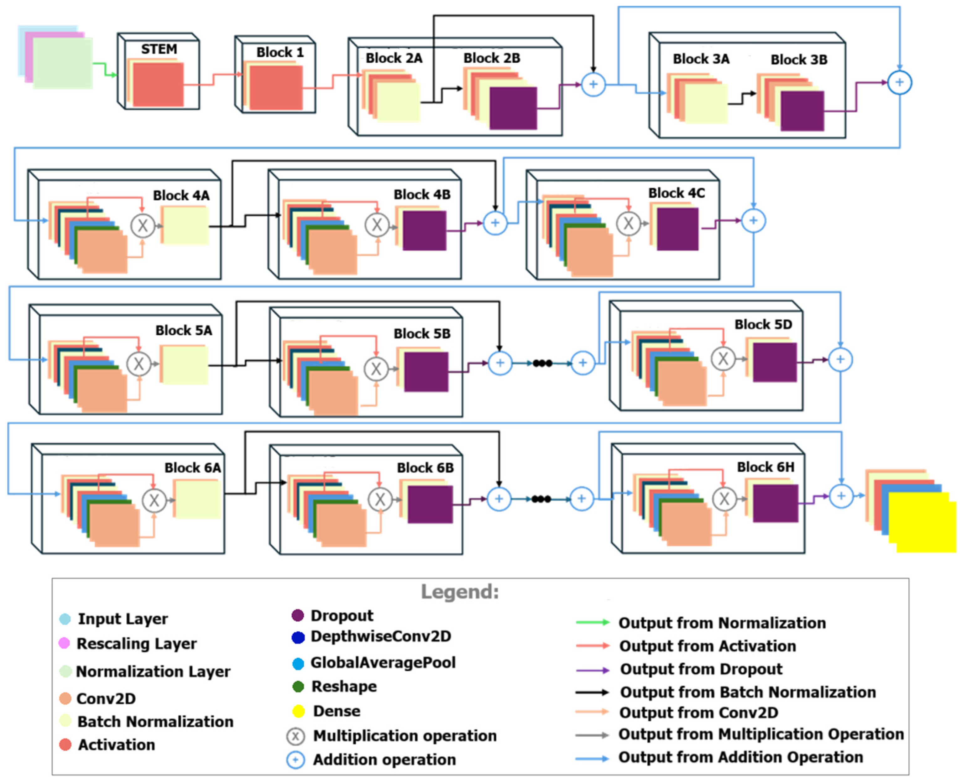 Figure 3, incorporates most of the layers usually met in the EfficientNet family such as Conv2D, BatchNormalization and GlobalAverage-Pooling2D, and a complex variation in DepthwiseConv2D, Squeeze-and-Excite (SE) Blocks, Dropout, Add and Dense layers. No additional Dropout layers were manually introduced beyond those embedded within the pretrained EfficientNetV2B0 backbone.