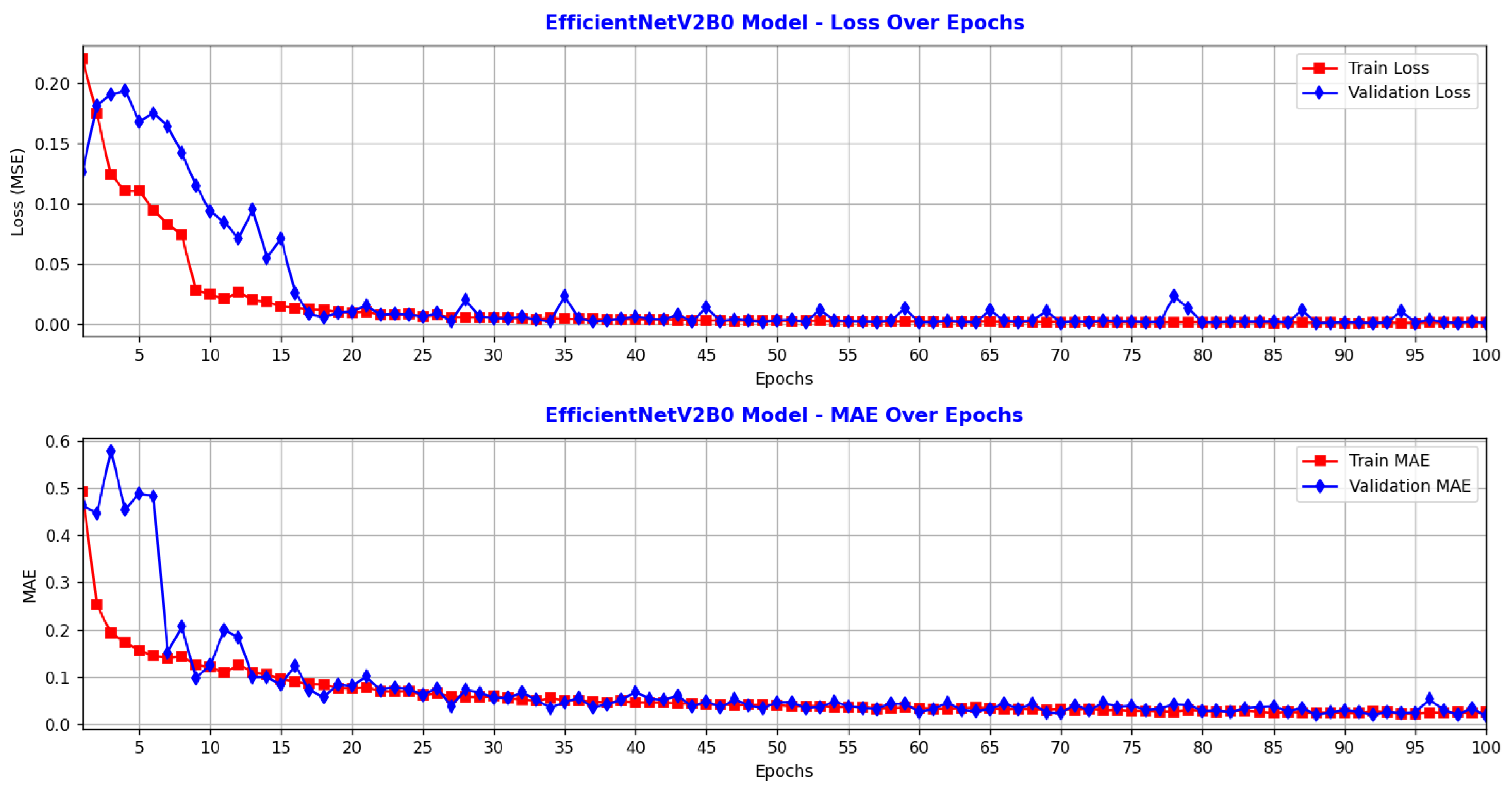 Initially, the weights of the pre-trained EfficientNetV2B0 layers were frozen to leverage the model’s learned feature representations. This allowed the network to act as a fixed feature extractor during the early stages of training. Subsequently, all layers were unfrozen to fine-tune the entire model on the specific dataset, allowing the pre-trained weights to adapt to the specific characteristics of the new task.