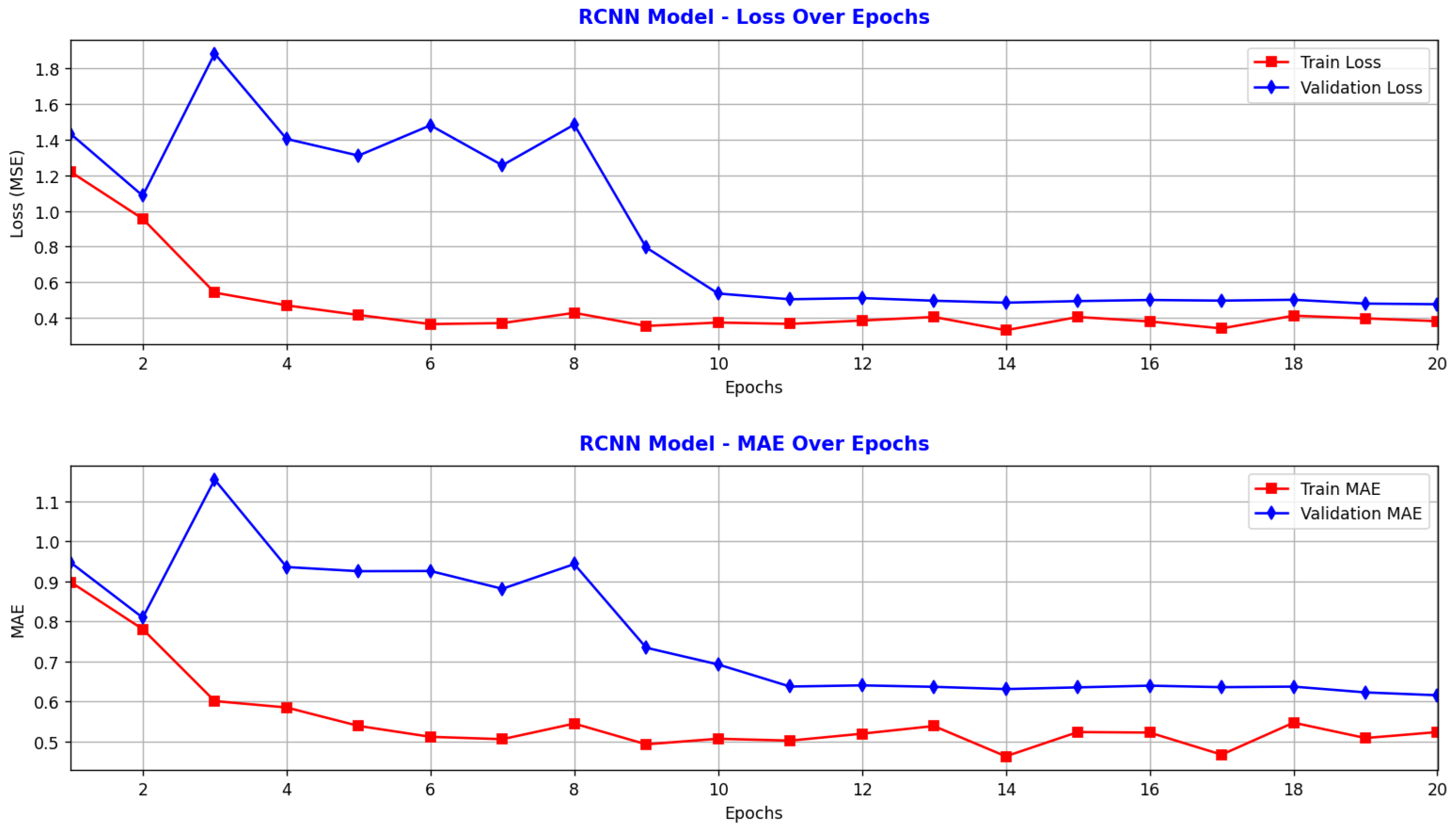 44]. CNN was trained on the CPU with a batch size of 32, a learning rate of 0.00001, and for 100 epochs. Notably, the accuracy was higher on the CPU compared to the GPU, especially due to differences in numerical precision and computational architectures between CPUs and GPUs. Training the RCNN on the CPU was not feasible with the same batch size due to computational constraints, preventing a direct comparison under identical conditions. Both environments used identical hyperparameters, dataset splits, and random seeds. The GPU implementation performed training in mixed precision (float16/float32) mode, which accelerates computation but can introduce rounding errors in small gradient updates, especially when the target variable (force) has low magnitude (in the order of newtons). The CPU, by contrast, performed all computations in float64 precision, preserving finer numerical detail during weight updates, which likely contributed to slightly improved accuracy.
