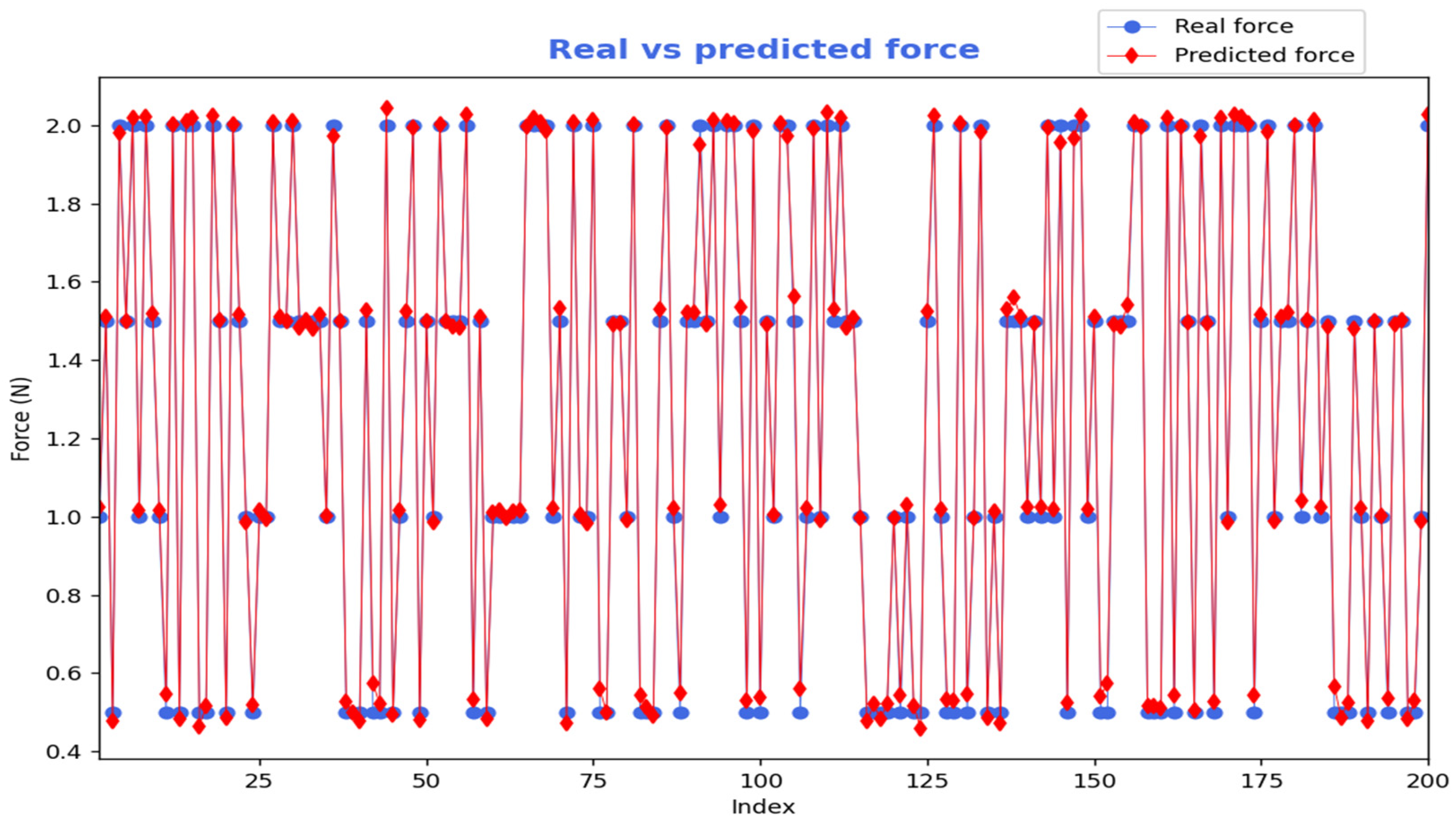 Figure 6 shows the predicted force, using EfficientNetV2B0 model, compared with the real force for a randomly selected subset of 200 images. The predicted forces (red) closely follow the overall trend of the real forces (blue). Most red markers lie very close to the blue ones, particularly at higher force levels, indicating a high overall estimation accuracy.