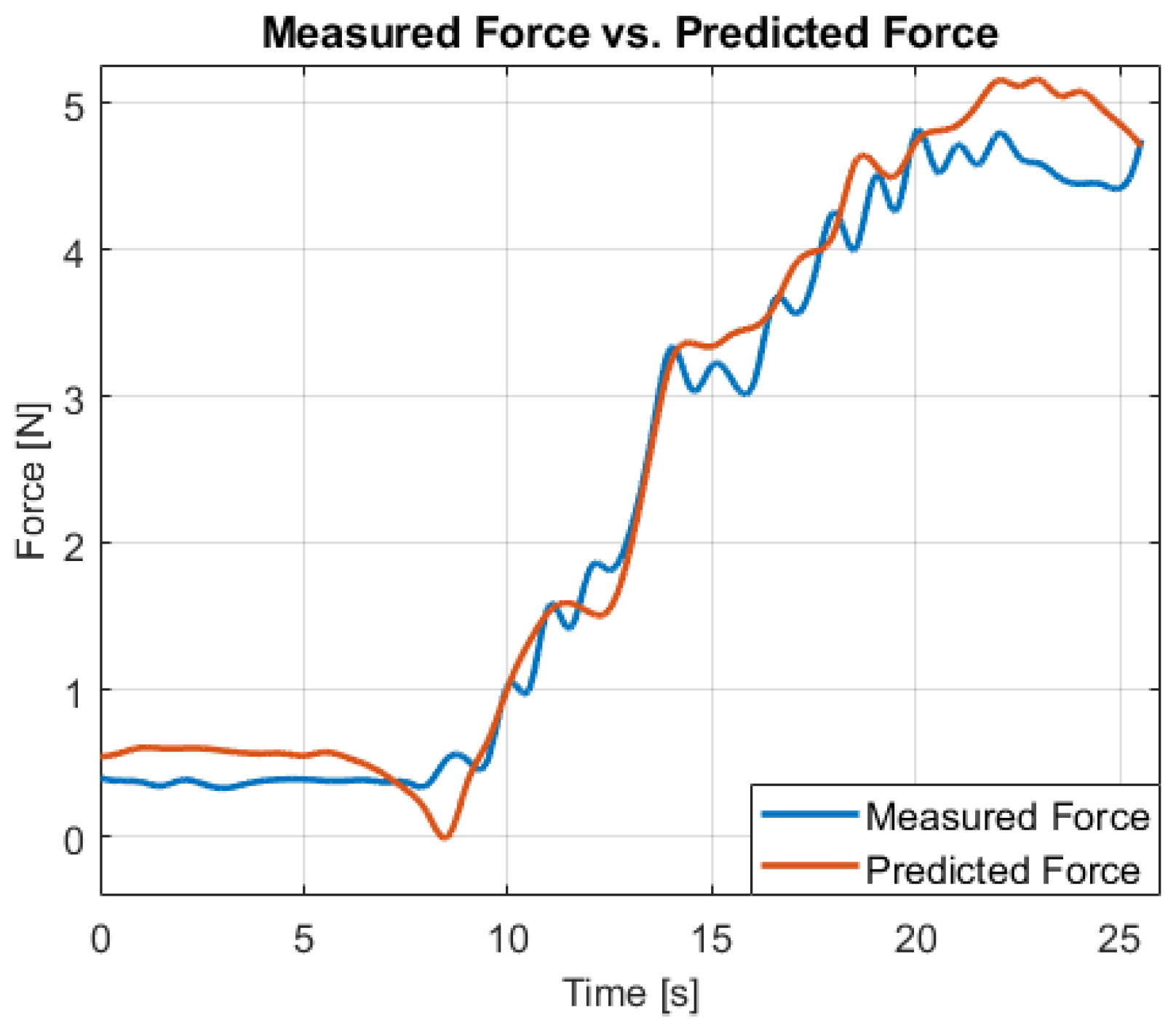 2 and a MAE of 0.0290 N. This indicates that, on average, the predicted force values deviated from the actual measured forces by approximately 0.0290 N. These metrics illustrate the model’s accuracy in calculating applied forces only from visual data derived from pictures depicting an esophagectomy intervention using biological tissue. Based on the 1937 images from the testing phase,