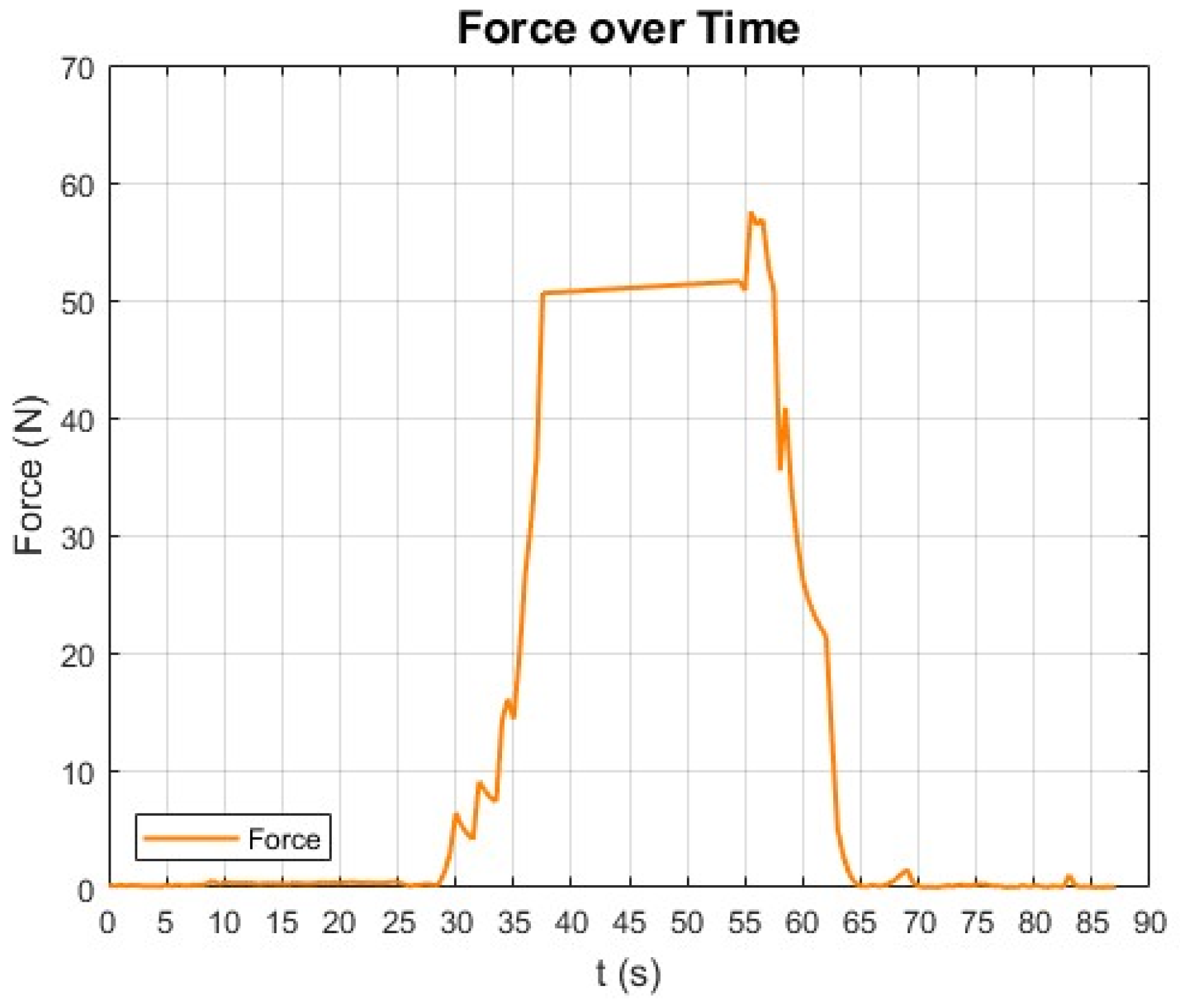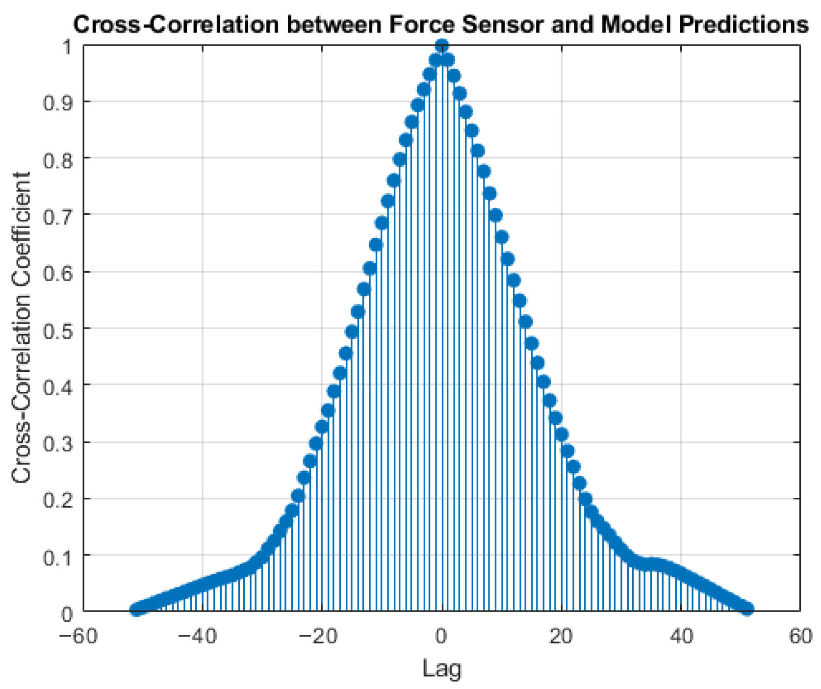 Figure 9 presents the Lag vs. Cross-Correlation Coefficient between the force sensor and the model prediction, which shows a good synchronization. A force-feedback loop must be both temporally aligned and stable over time. Cross-correlation quantifies dynamic alignment between the estimate and the load cell, reporting the peak correlation and the lag at that peak. For haptics, small lag and high correlation indicate that the displayed force cue tracks the true force closely in time. In our data, the peak occurs at 0 ms with r = 1, consistent with tight temporal alignment at the deployed update rate. Values near zero lag indicate that the estimator tracks onset and release of traction with minimal delay, which is critical for intuitive haptic feedback. Confidence intervals use a block bootstrap (1 s blocks) to account for autocorrelation.
