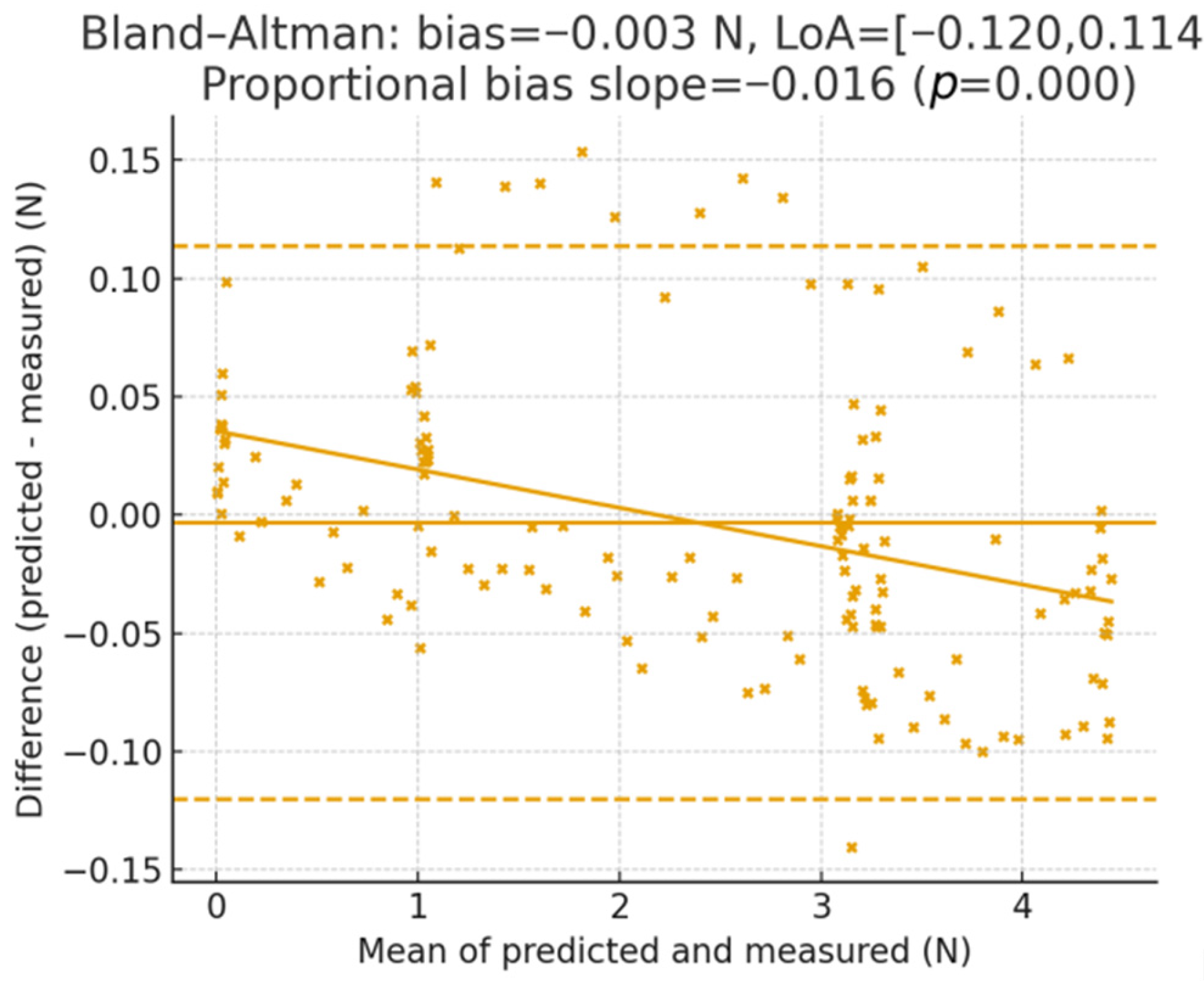 Figure 11 presents the mean measured force vs. mean predicted force within deciles of the prediction, with the identity line. The annotated slope/intercept summarizes scale fidelity and bias; gray bands show 95% CI via bootstrap.
