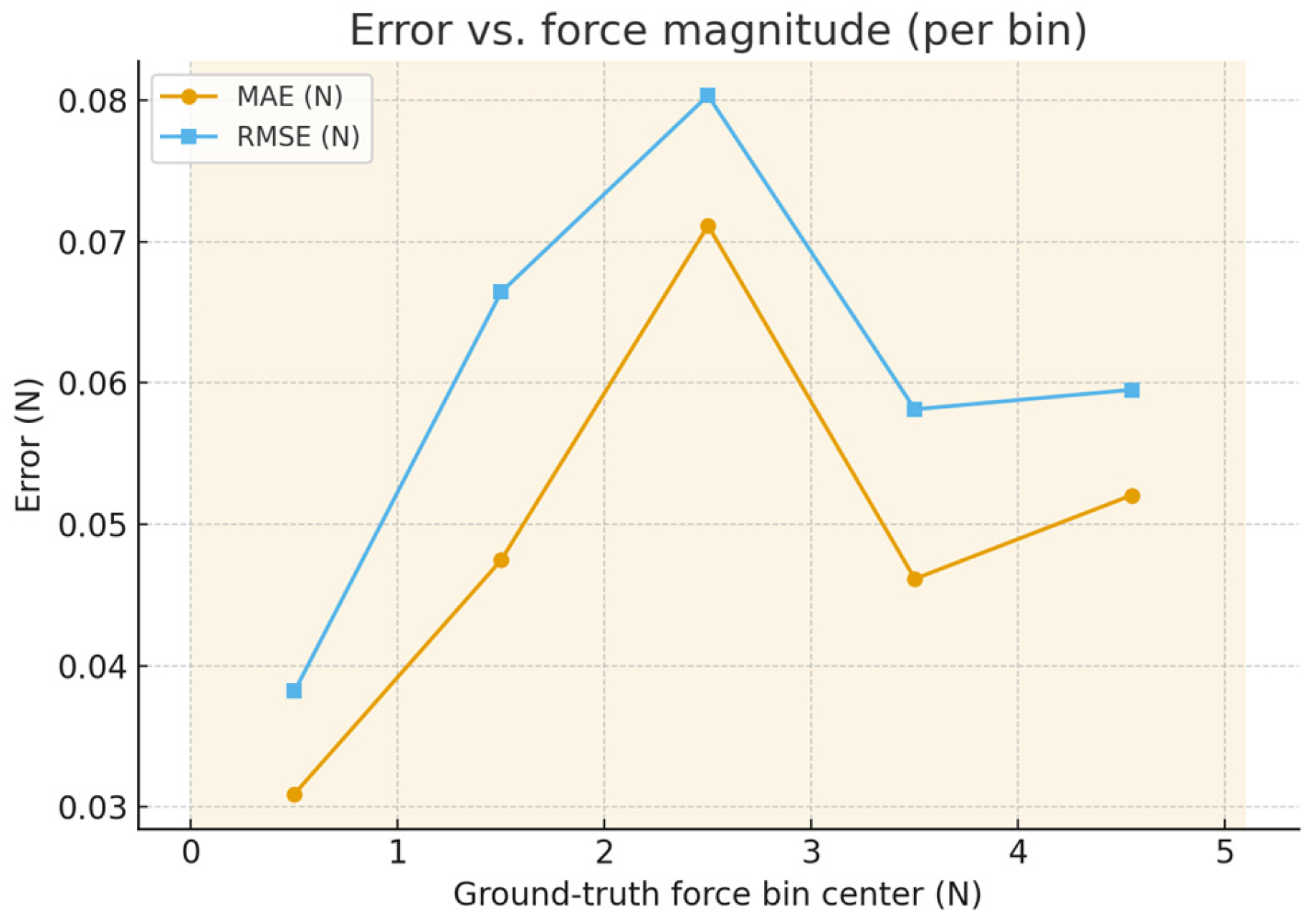 Figure 13 shows per-bin MAE and RMSE across ground-truth force bins; background shading marks Green (0–3 N), Yellow (3–4.5 N), and Red (>4.5 N) bands. This links numeric errors to clinically meaningful ranges.