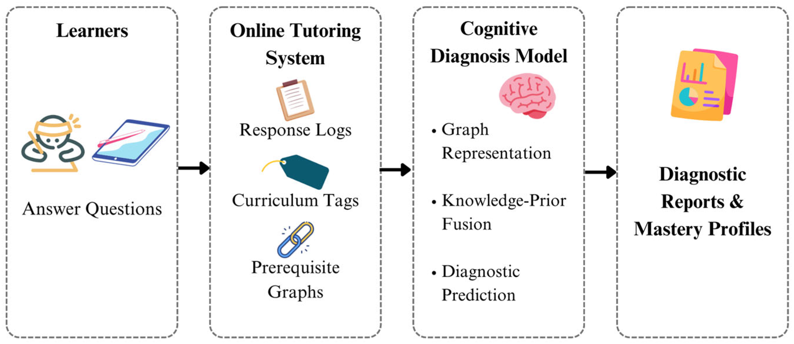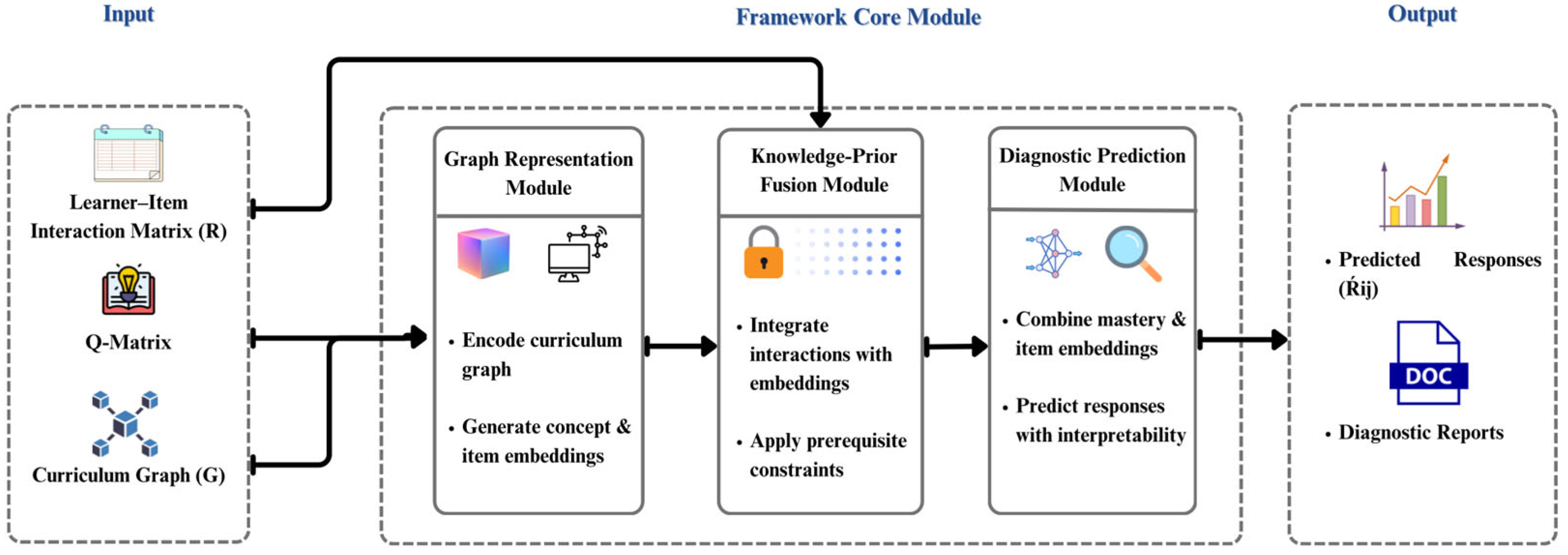 - Diagnostic Prediction Module: predicts learner performance while generating interpretable attention-based diagnostic reports.