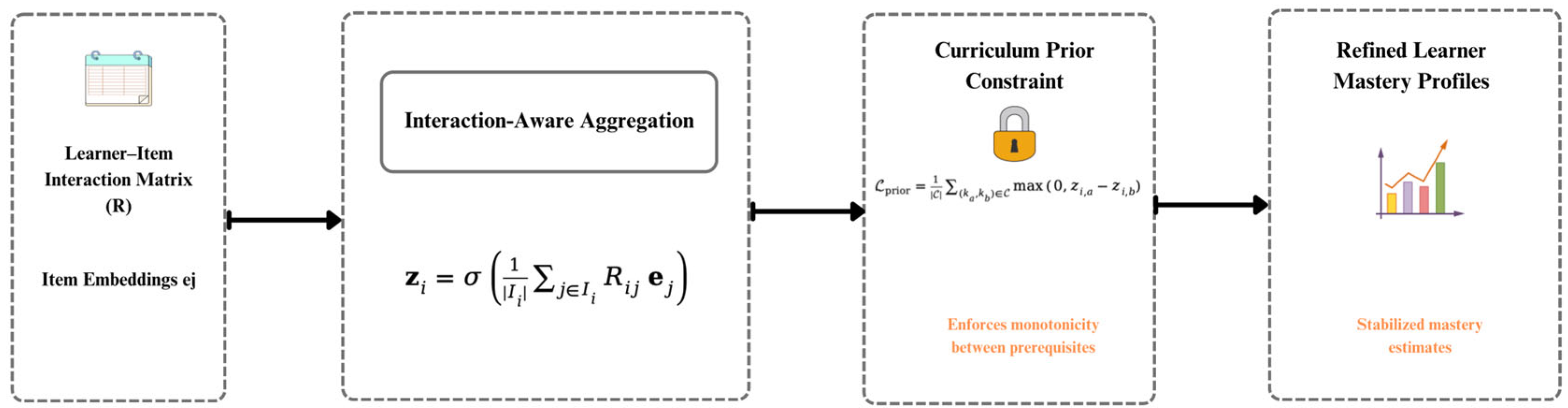 - Knowledge-Prior Fusion Module: integrates learner–item interactions with embeddings and aligns them with curriculum priors through constraint-based fusion.