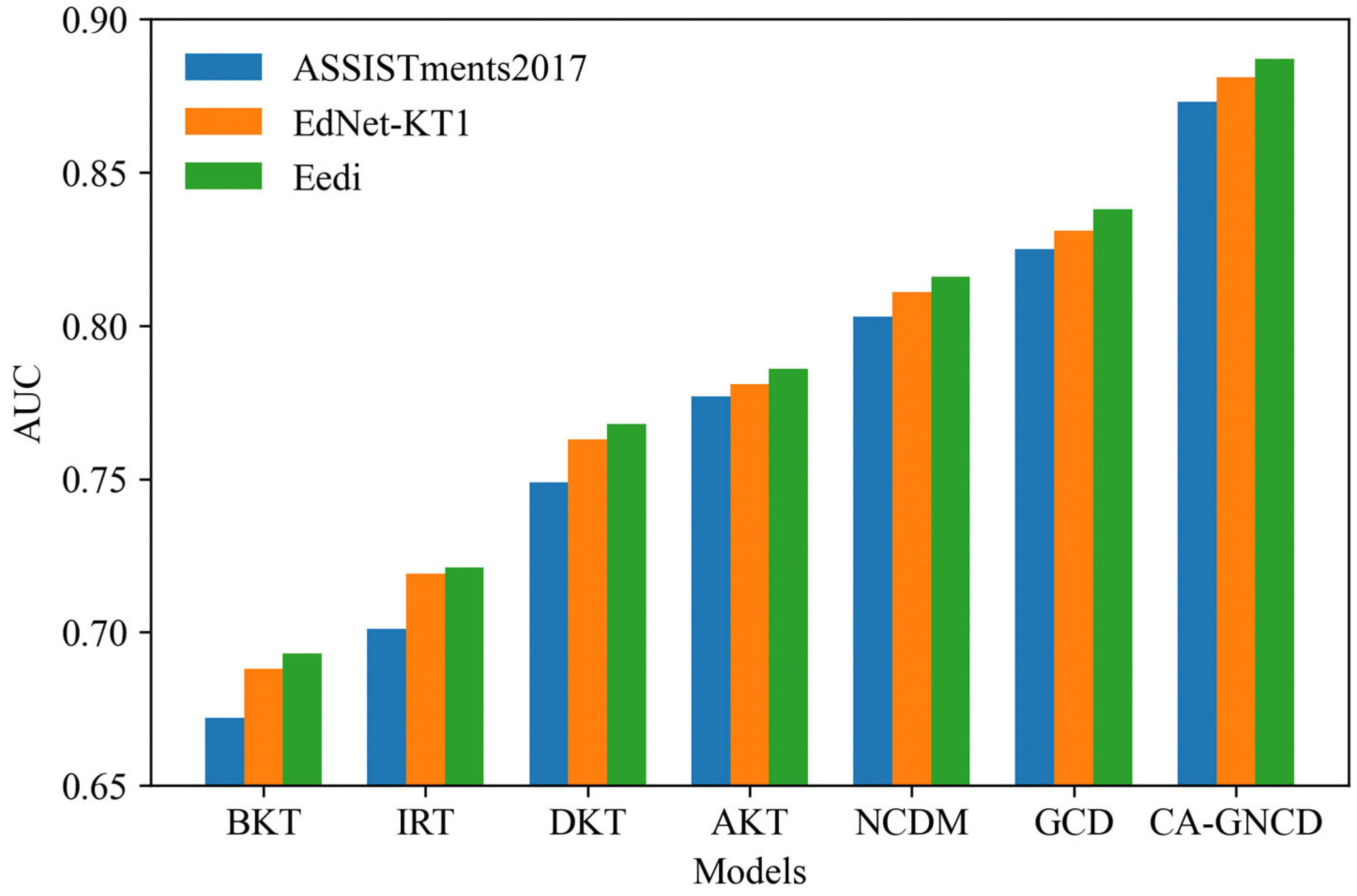 | Model | ASSISTments2017 (AUC) | EdNet-KT1 (AUC) | Eedi (AUC) | Avg. ACC (%) | Avg. F1 |