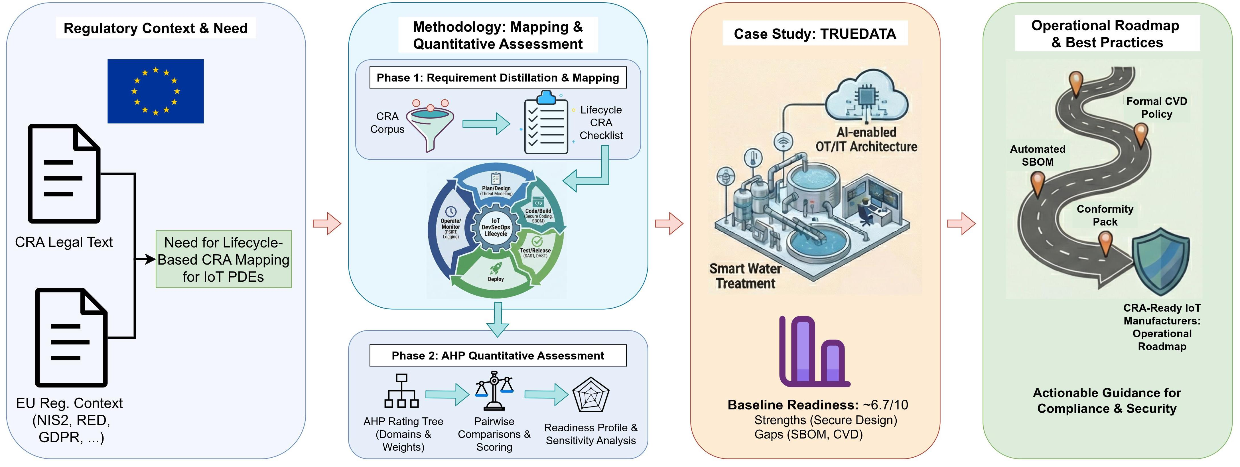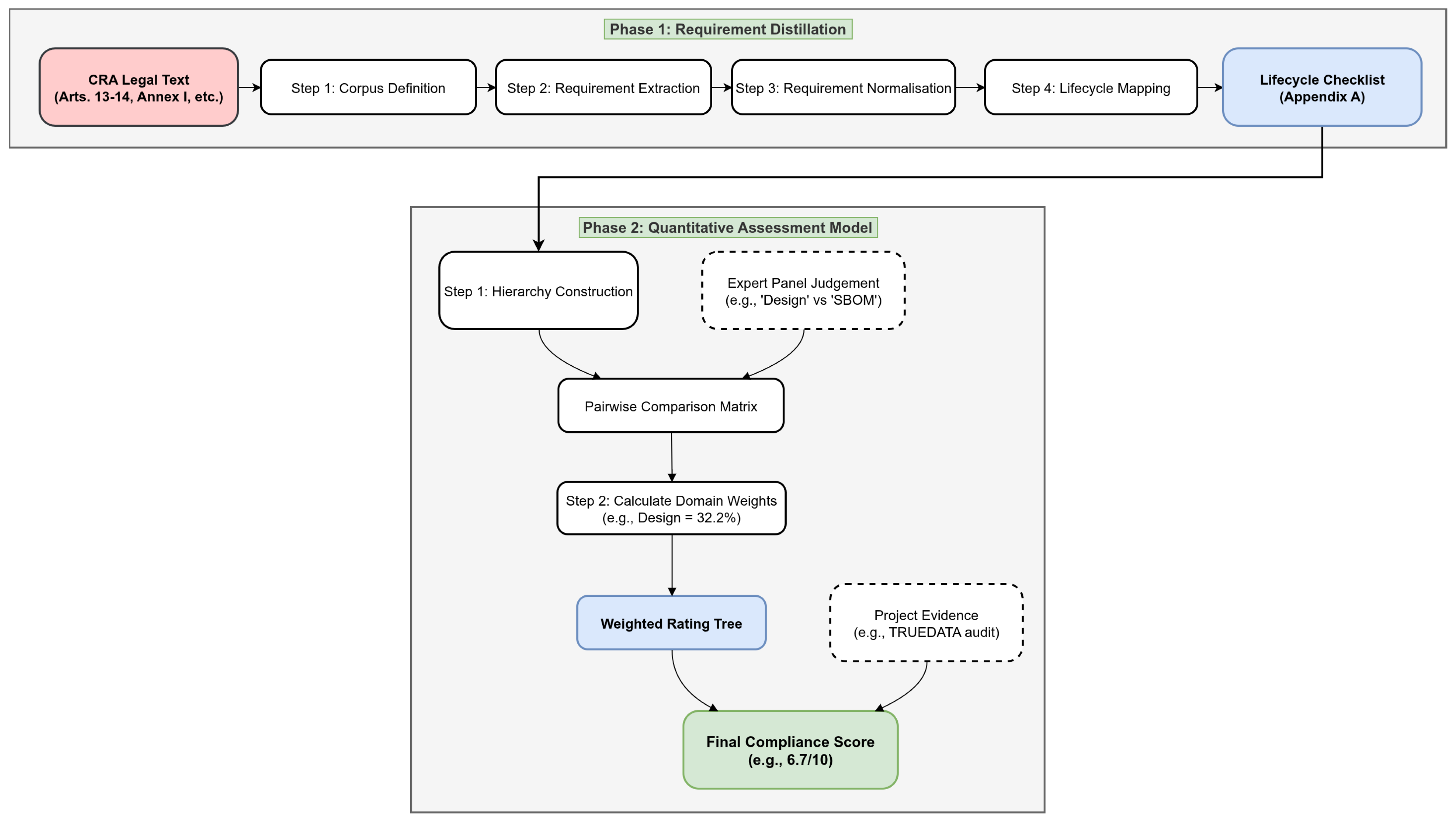 To formalize and detail a two-phase methodology. Phase 1 consists of a systematic process for extracting, normalizing, and mapping legal requirements from the CRA onto the Development, Security, and Operations (DevSecOps) lifecycle. Phase 2 introduces a quantitative assessment model, using the Analytic Hierarchy Process (AHP), to derive consistent risk-informed weights for compliance domains and enable a structured evaluation of readiness.