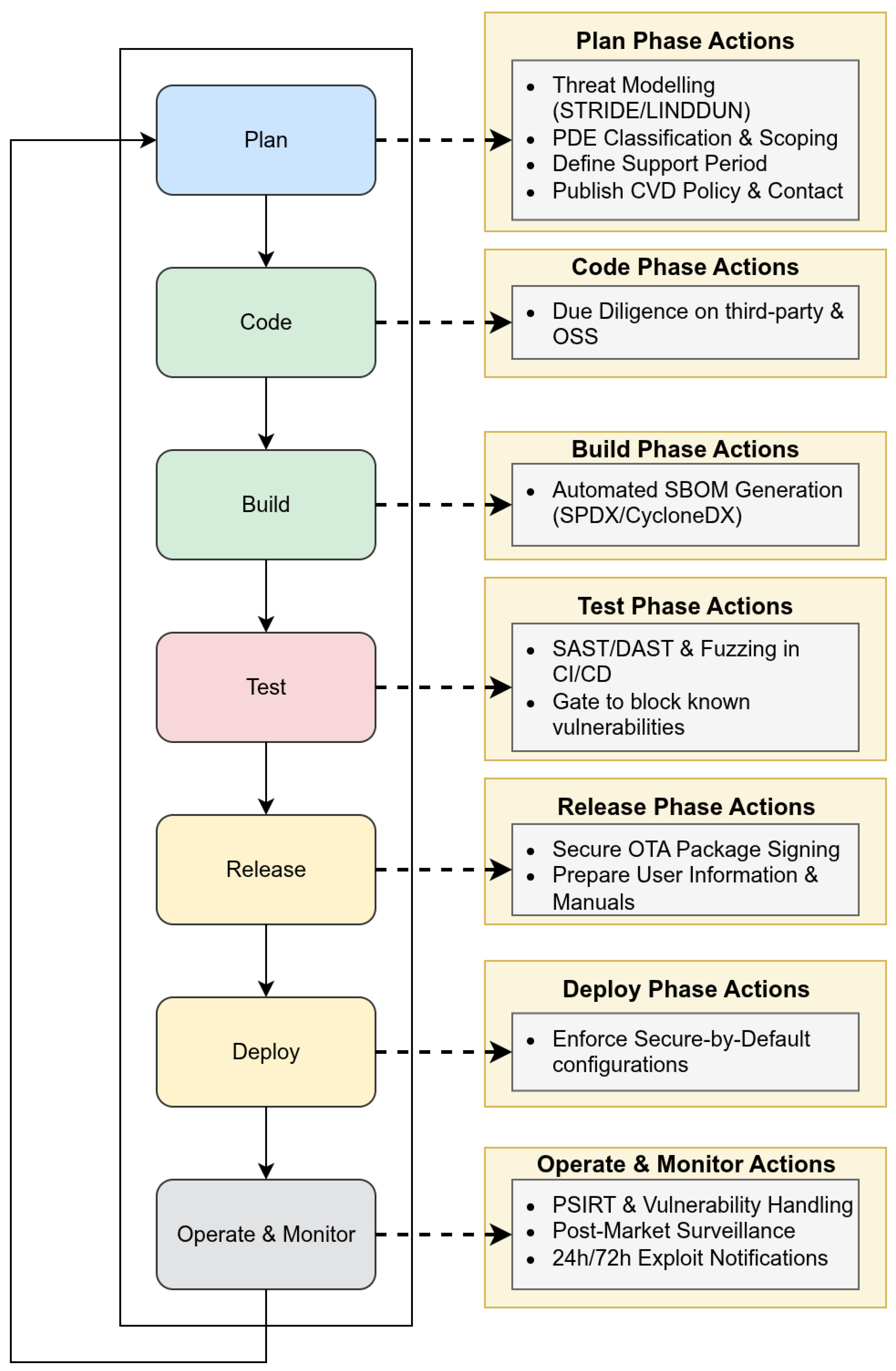 In parallel, the CRA mandates machine-readable SBOMs and secure automatic over-the-air (OTA) update mechanisms. Every dependency change should trigger SBOM generation (CycloneDX or SPDX), license validation, and Common Vulnerabilities and Exposures (CVE) queries to spot known vulnerabilities. The OTA channel must use encrypted and digitally signed protocols, include a clear user opt-out, and be complemented by collective remote attestation (e.g., Scanning, Analysis, Response and Assessment (SARA)) to verify the integrity of devices in production (see