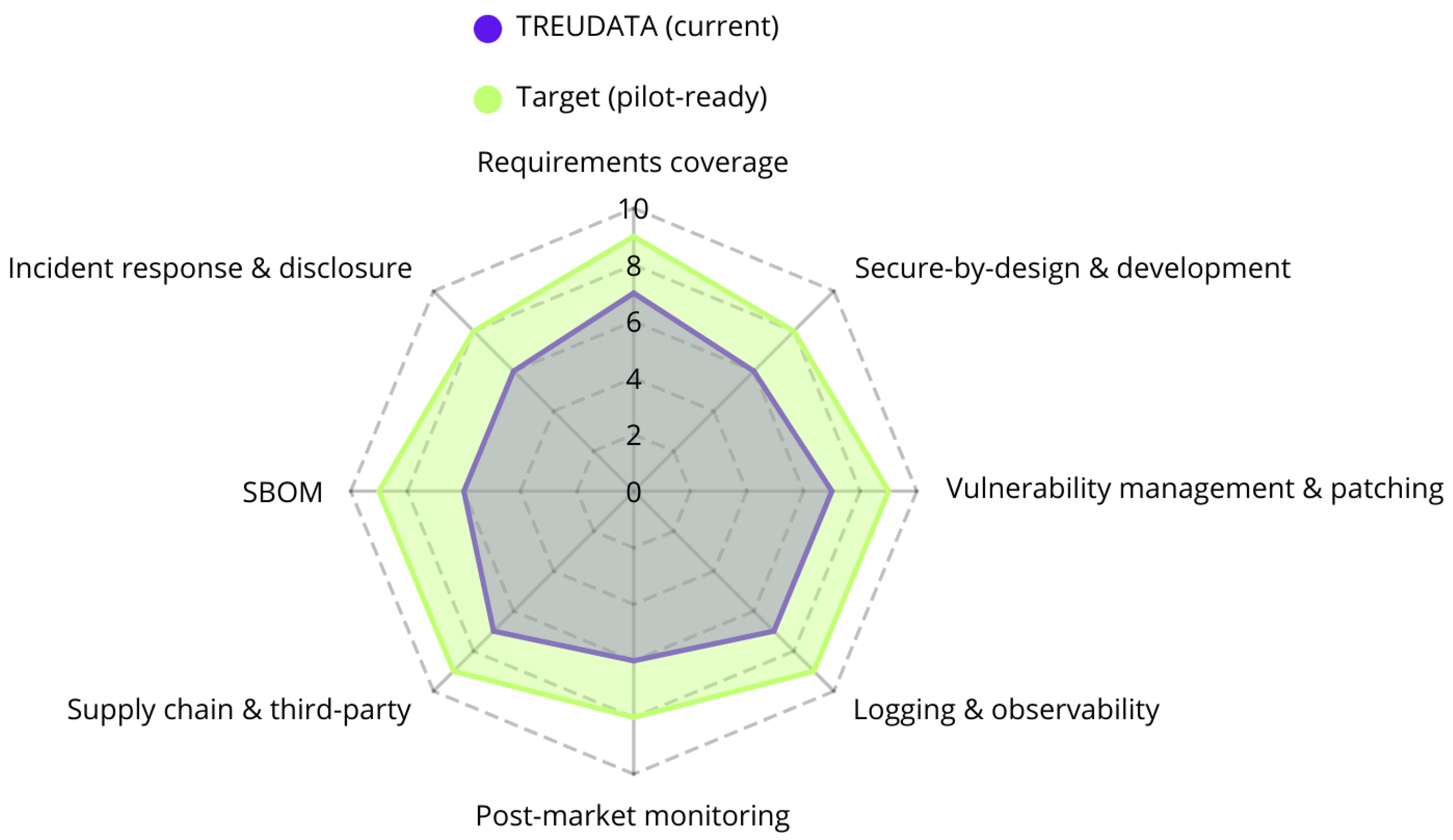 Table 6. The rationale for this ‘medium-risk’ score becomes clear upon analysis: whilst the project scored highly in technically mature domains (e.g., 9.2/10 for ‘monitoring’ and 8.0/10 for ‘design’), the overall score is quantitatively impacted by significant high-risk gaps in key governance areas. Specifically, the low scores for ‘SBOM and supply chain’ (3.5/10) and ‘coordinated vulnerability disclosure’ (3.0/10)—both fundamental CRA requirements—demonstrate how procedural and documentary gaps directly reduce the measured readiness despite the system’s technical robustness. The gap to the pilot-ready target, which requires closing these specific gaps, is illustrated in