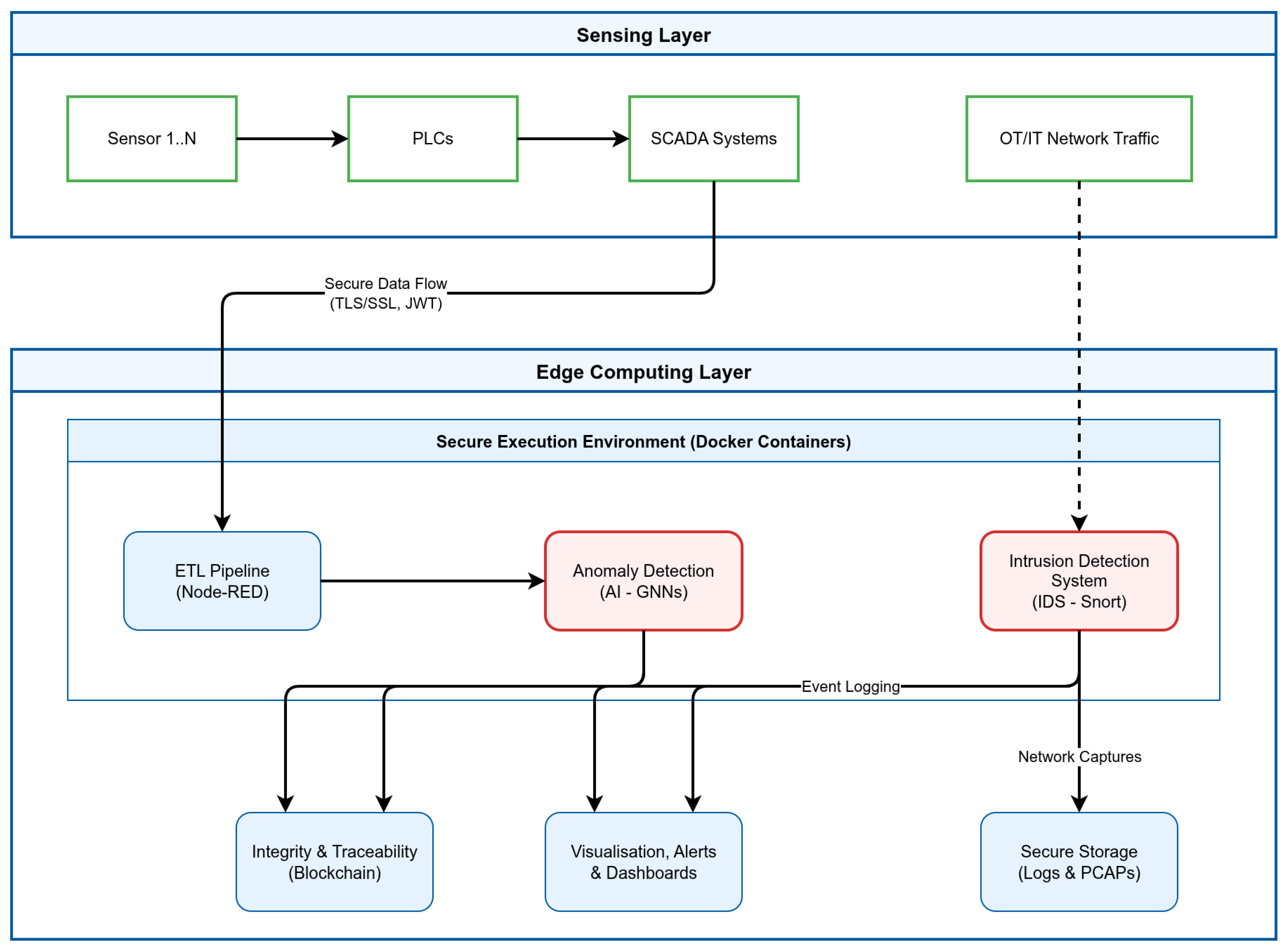 TRUEDATA performs strongly in technical execution because its end-to-end data path is explicit, instrumented, and secure by design. The architecture is built on a foundation of robust technologies, including a sophisticated Extract--Transform--Load (ETL) pipeline orchestrated in Node-RED for data validation, AI models such as Graph Neural Networks (GNNs) for OT anomaly detection, and a Snort-based industrial Intrusion Detection System (IDS) for network monitoring. This technical maturity justifies high marks in categories related to monitoring, data integrity, and secure design principles.
