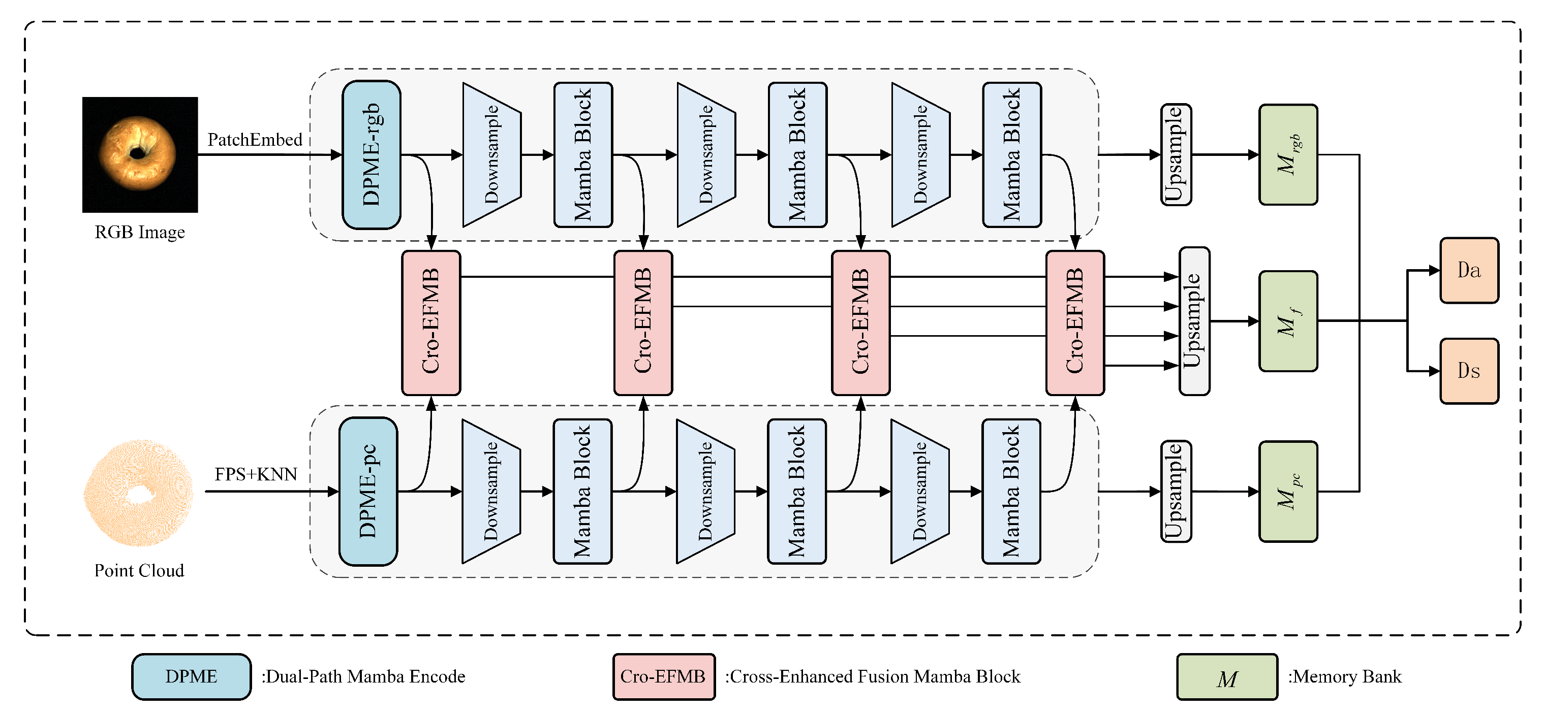 - w/o DPME: The bidirectional Mamba encoder is removed, and the RGB and point cloud features are simply concatenated before being fed into the subsequent modules.
