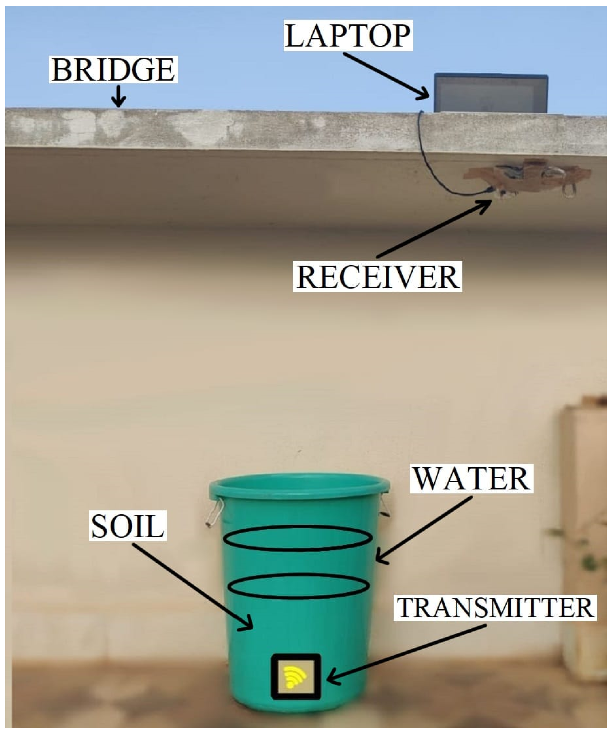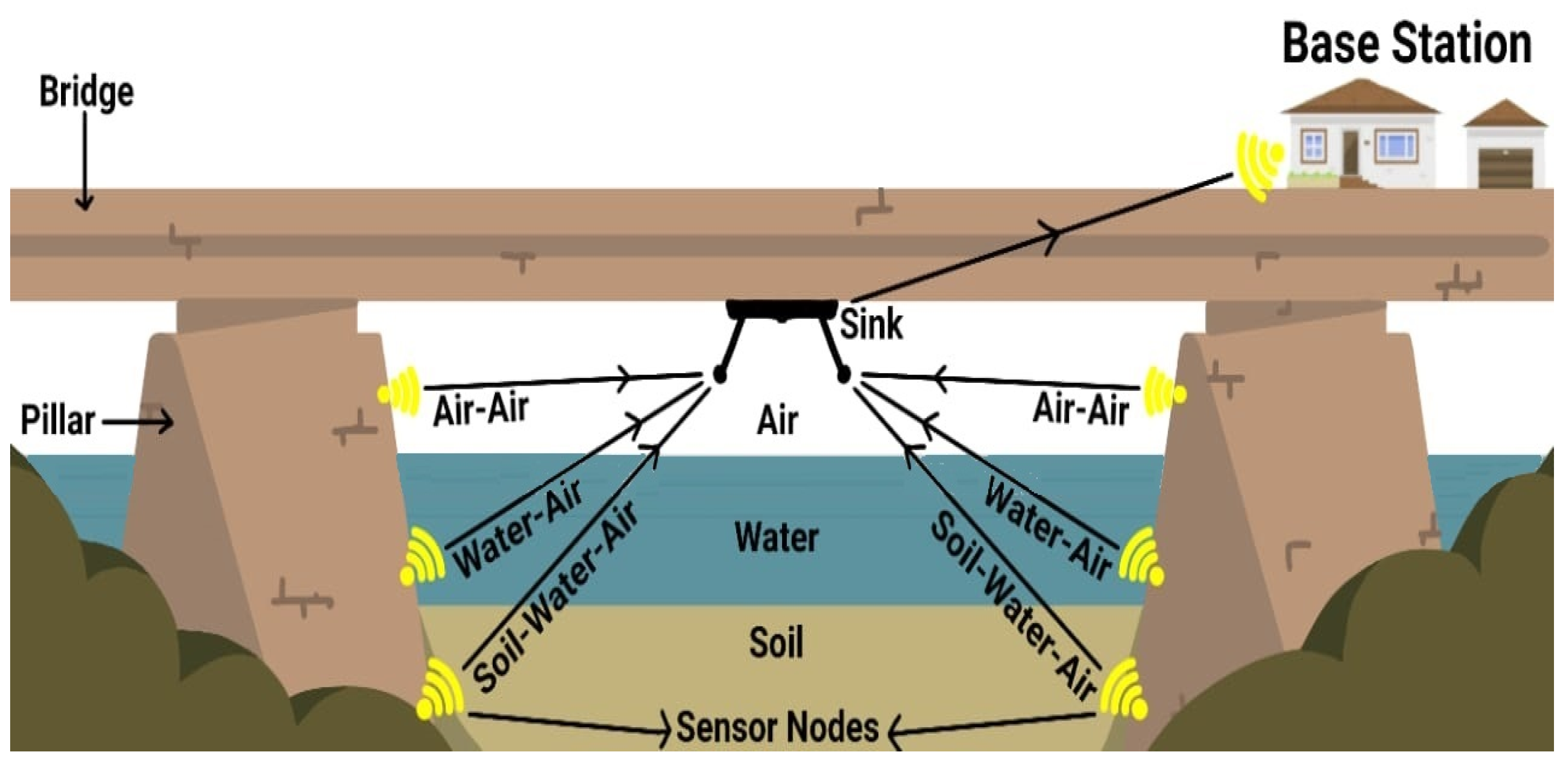 A wireless underground sensor network (WUSN) is an interconnection of sensor nodes buried underground that extract underground information of interest. They have been applied in smart agriculture, mine safety, disaster alerts, military applications, underground pipeline monitoring, and underground infrastructure health-monitoring systems [1,2,3,4,5,6,7]. Monitoring the health of river bridges is necessary as damage to any bridge may lead to severe rail and road accidents. A wireless sensor network (WSN) can be used to monitor the health of a bridge [8,9]. However, monitoring the health of a river bridge pillar that is submerged in water using WUSN is a challenge.