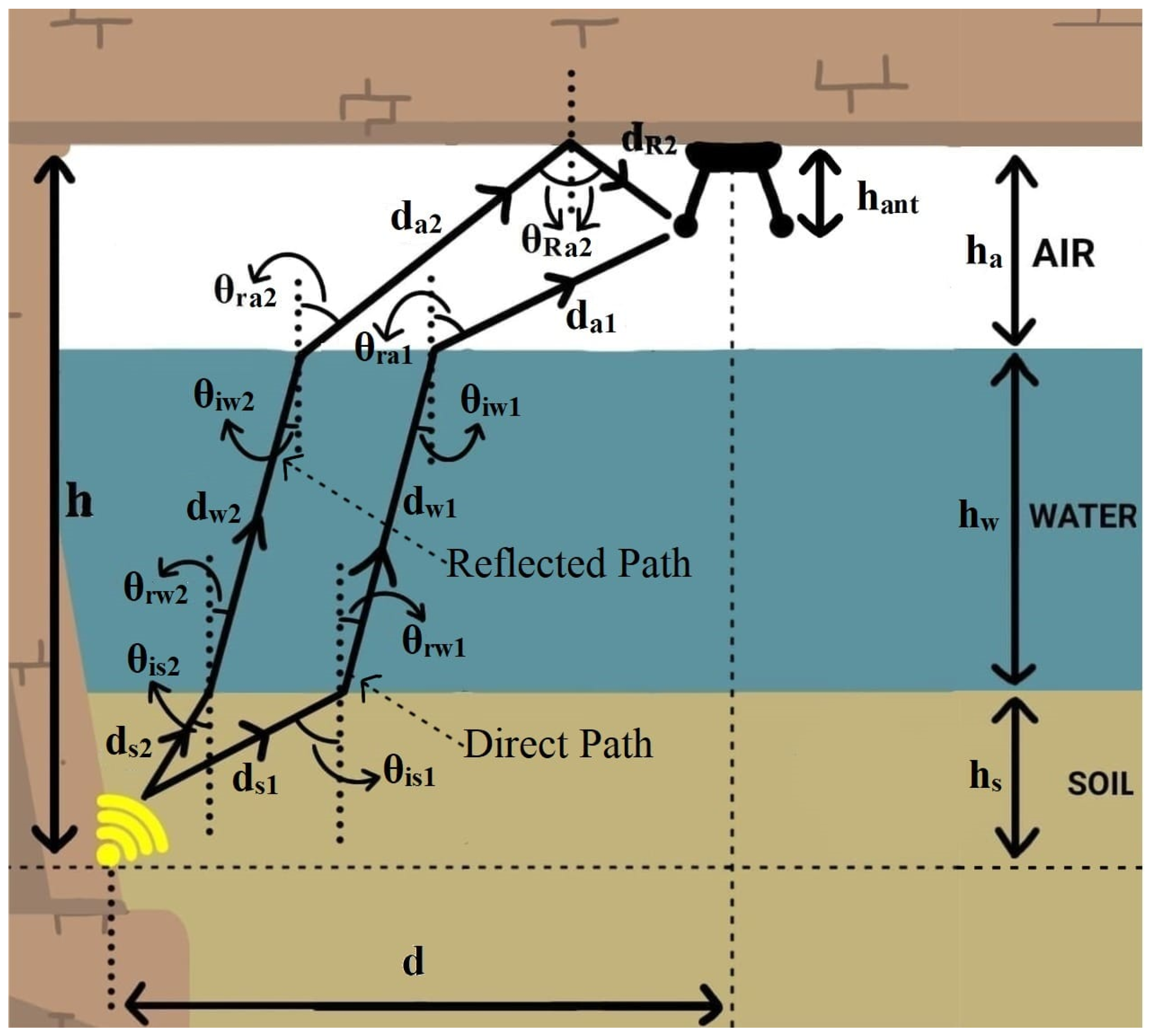 Transmission of a signal through a reflected path encounters reflection and refractions at the soil–water and water–air interface, along with the reflection at the air–bridge interface. However, reflection and refraction losses at the soil–water and water–air interfaces have already been included in the direct path loss. Thus, path loss along the reflected route comprises of a single component only [17].