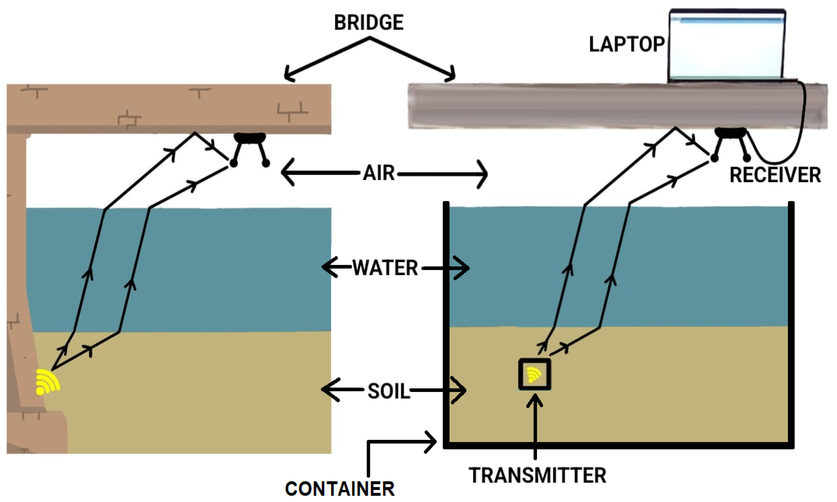 This section presents the attenuation model used for assessing the structural health of a bridge pillar. Figure 2 depicts a typical scenario, where the health of the underground portion of the pillar is sensed by the node and sends the sensed data to the node placed just under the bridge. It is assumed that the sensor placed at the bottom of the pillar has soil and water above it. The water above the soil surface is assumed to be still in this work. Further, the received signal consists of a signal from a direct path and several reflections from multiple paths. However, for simplicity, we have considered the two-ray model as depicted in the figure. Thus, it can be observed from the figure that the transmitted signal travels to the receiver through soil, water, and air in two different paths.