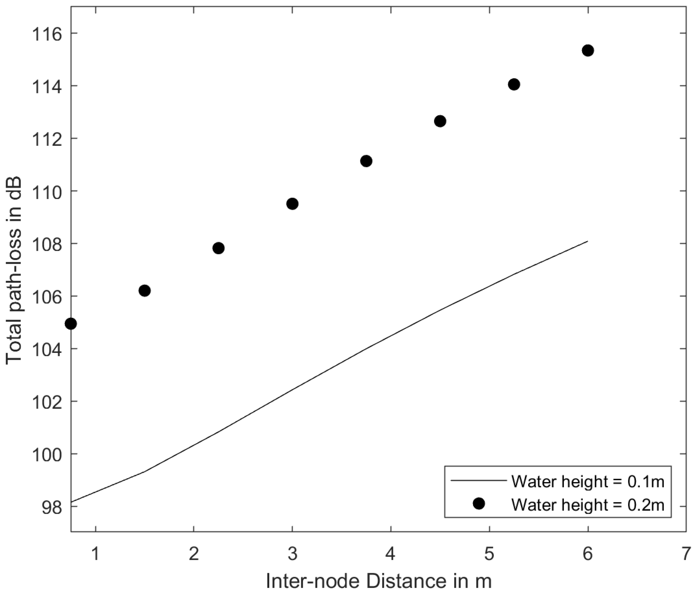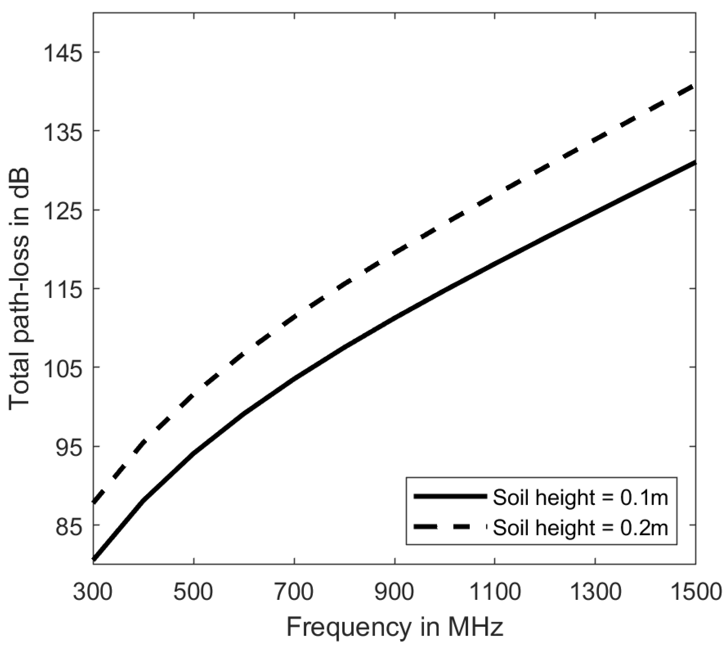 Path loss through water [11,30] and soil [21] is represented by Equation (6) and Equation (7) respectively.