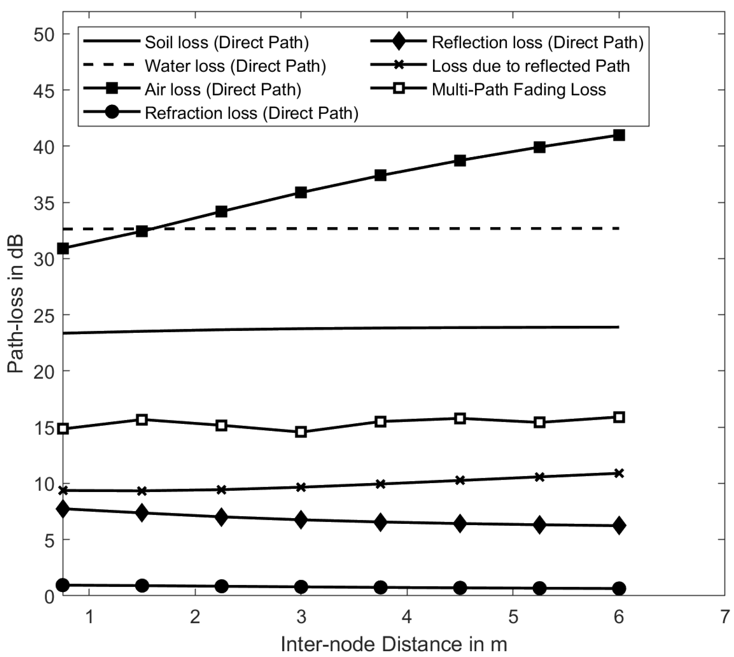 The challenges encountered in deploying sensor networks that communicate through the air–air channels are discussed in [14]. Signals that completely travel through the air in terrestrial wireless sensor networks (WSNs) and implementations of terrestrial WSNs are discussed in [15]. These research findings show that path loss in the air varies with the frequency of the signal, horizontal and vertical inter-node separation, and antenna gains [10,16].