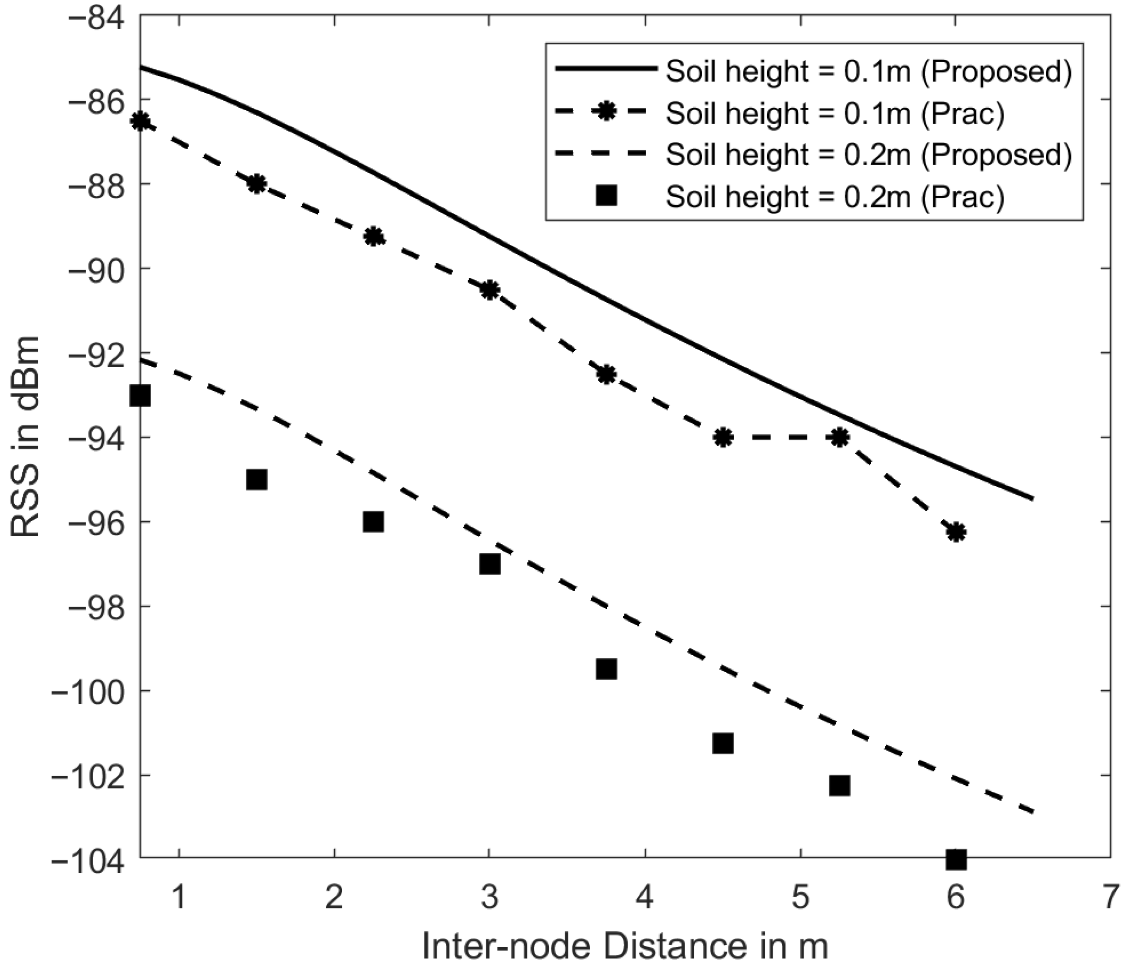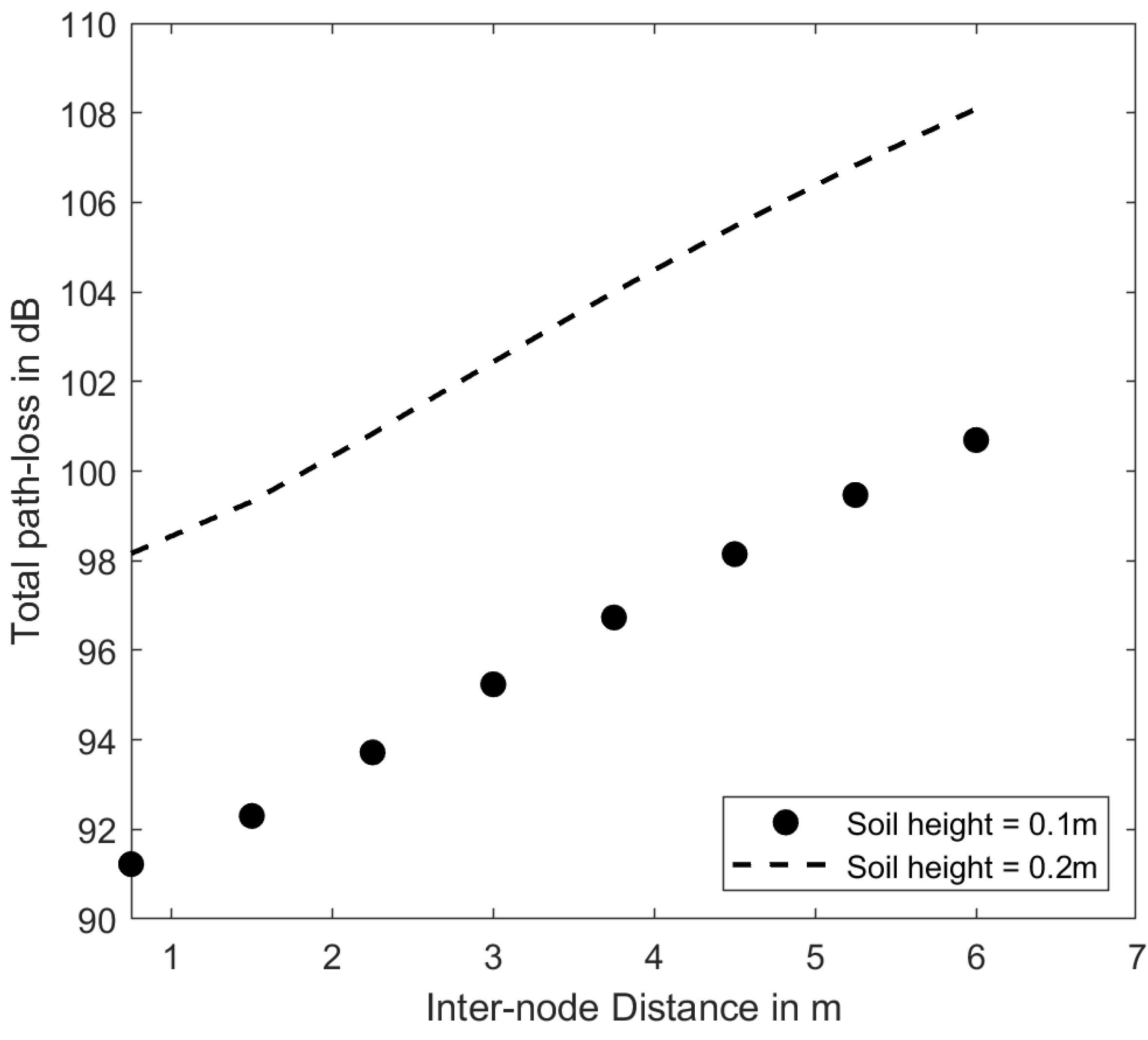 The development of terrestrial sensor networks has generated interest among researchers in exploring the prospects of sensor networks in other challenging transmission media such as water and soil. The signals travelling through the soil in WUSNs and their applications are analysed in [17,18,19]. Signals in underground networks follow one-ray [20] and two-ray [21] propagation mechanisms. Path loss in underground networks is significantly affected by changing soil burial depth and inter-node distance [20,21].
