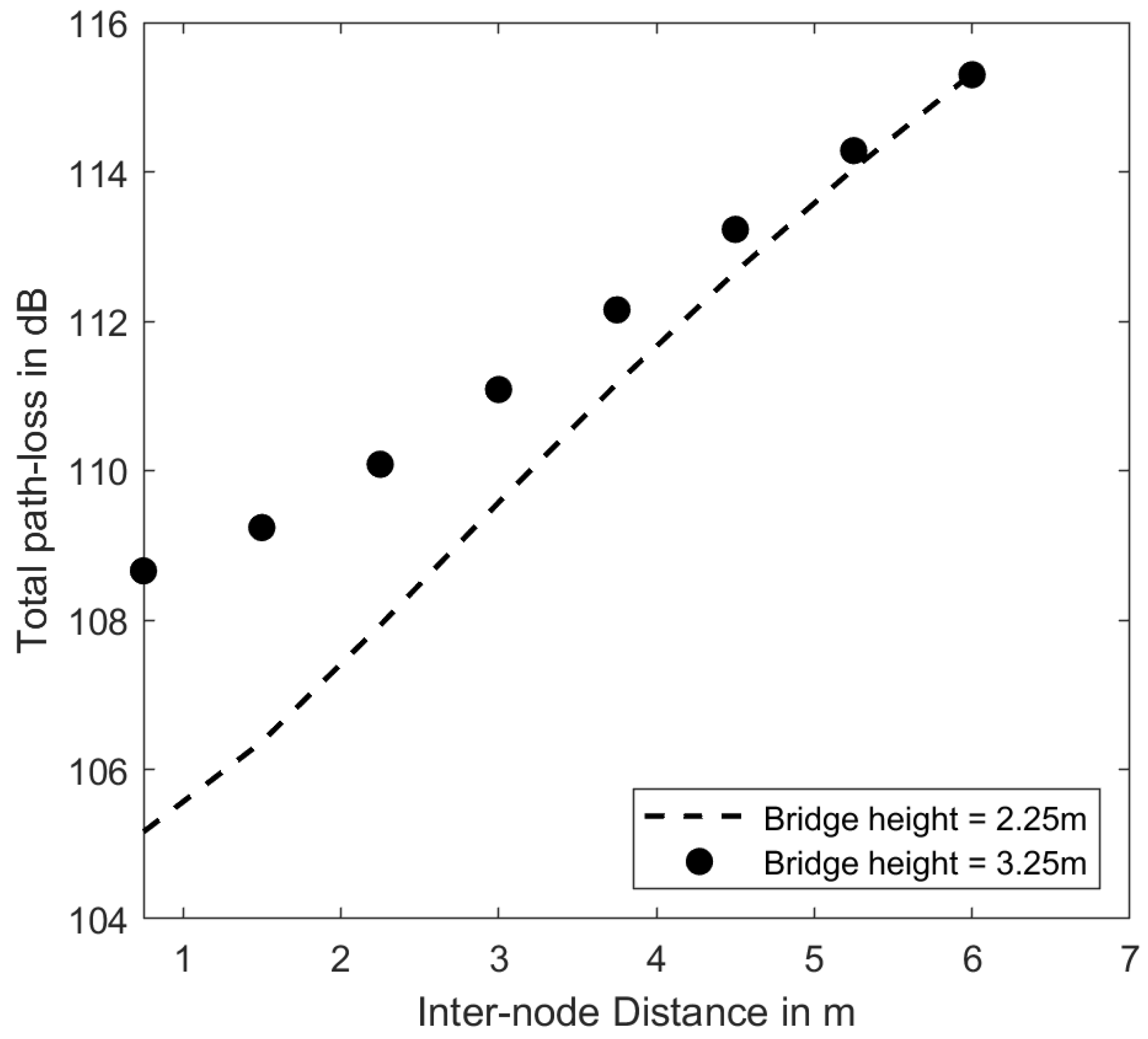 Figure 12. Path-loss vs. horizontal inter-node distance with different bridge heights; water level = 0.2 m, soil burial depth = 0.2 m.