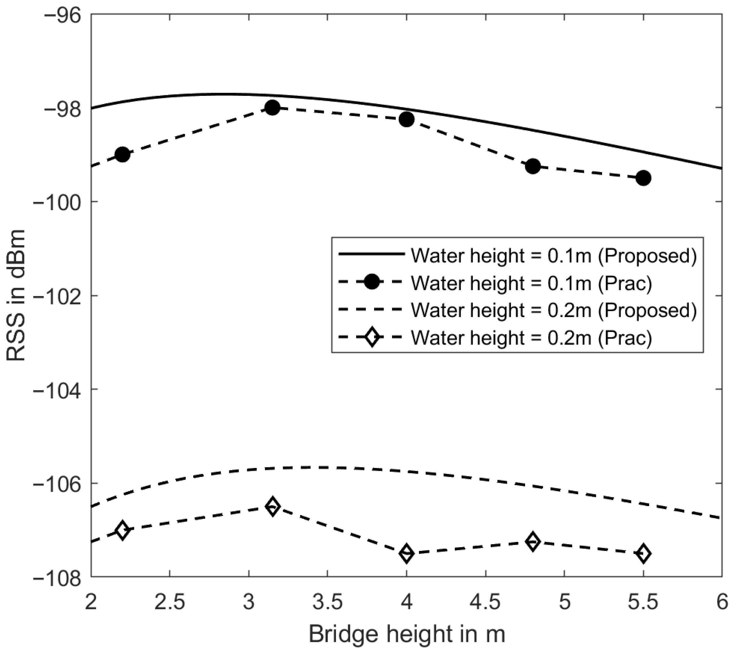 Figure 13. RSS vs. bridge heights with different water levels; soil burial depth = 0.2 m, horizontal inter-node distance = 6.5 m.