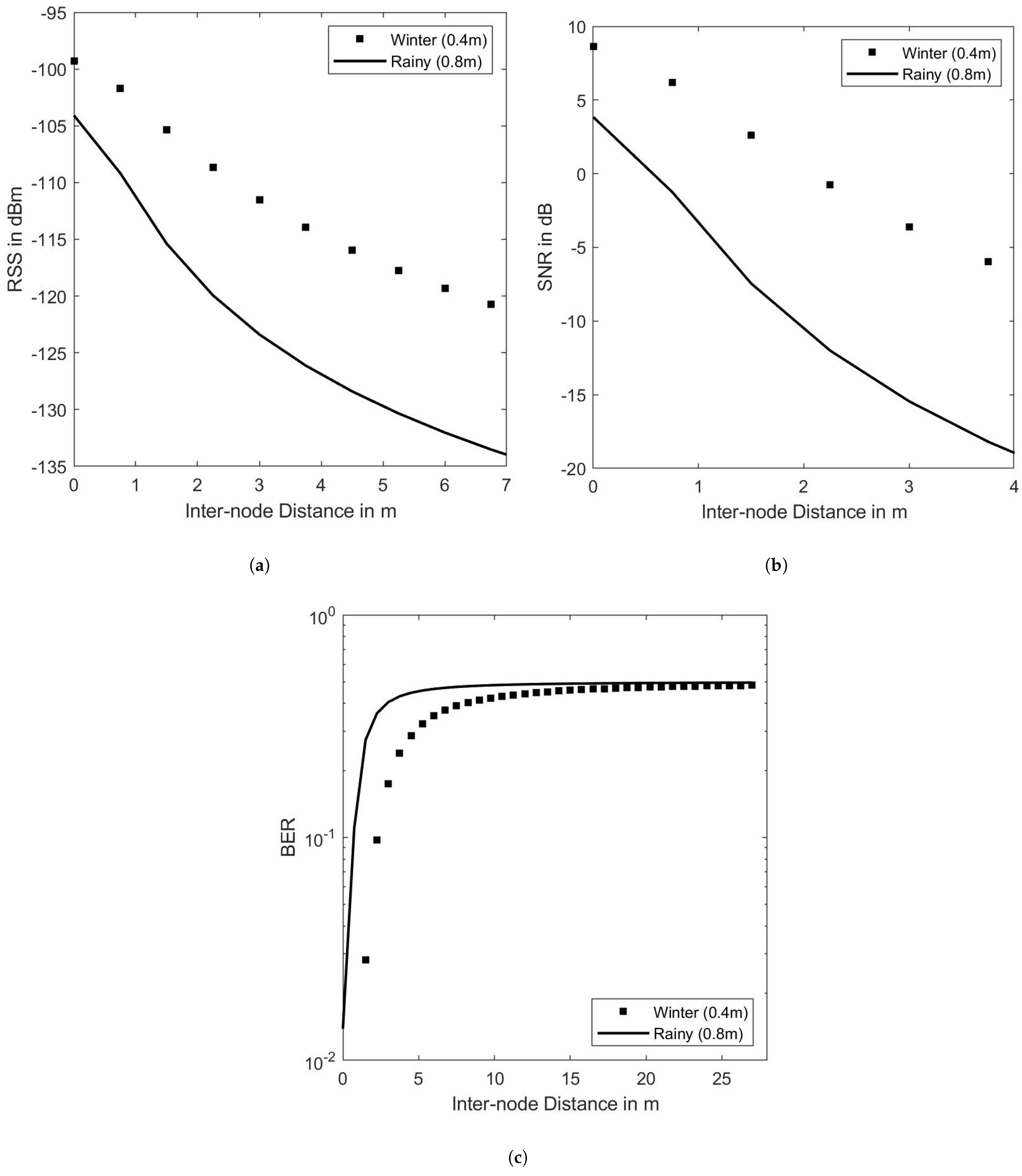 Figure 15. Variation in transmission link quality vs horizontal inter-node distance with diff for water levels during different seasons. Transmission link quality is represented by (a) RSS, (b) SNR, and (c) BER; soil burial depth = 0.2 m, bridge height = 1.5 m.