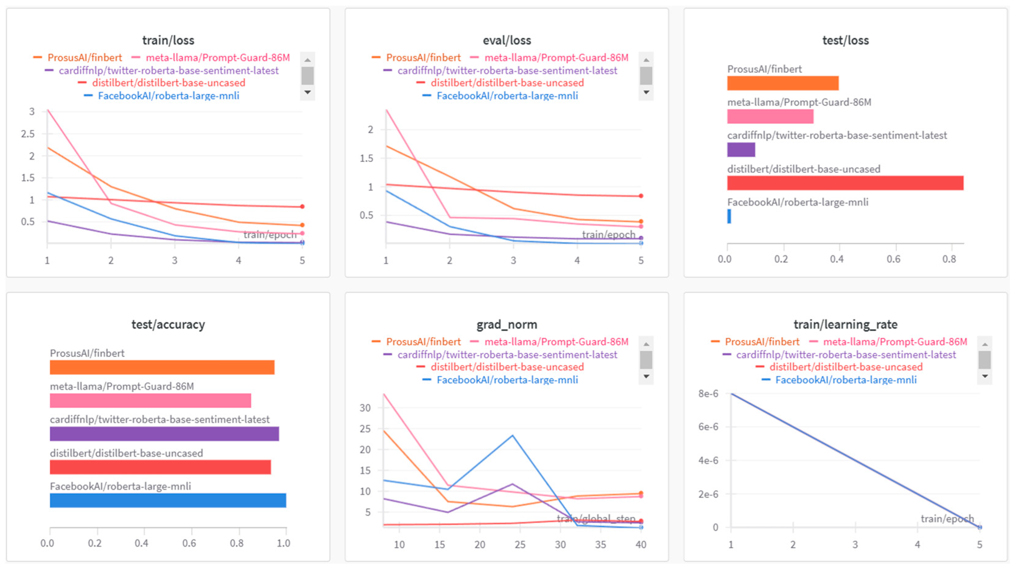 - Stability Patterns: Lower gradient norms (RoBERTa-large-MNLI, Twitter-RoBERTa) generally correlate with more stable accuracy improvements, while higher norms (Prompt-Guard-86M, FinBERT) indicate more dramatic learning adjustments.
