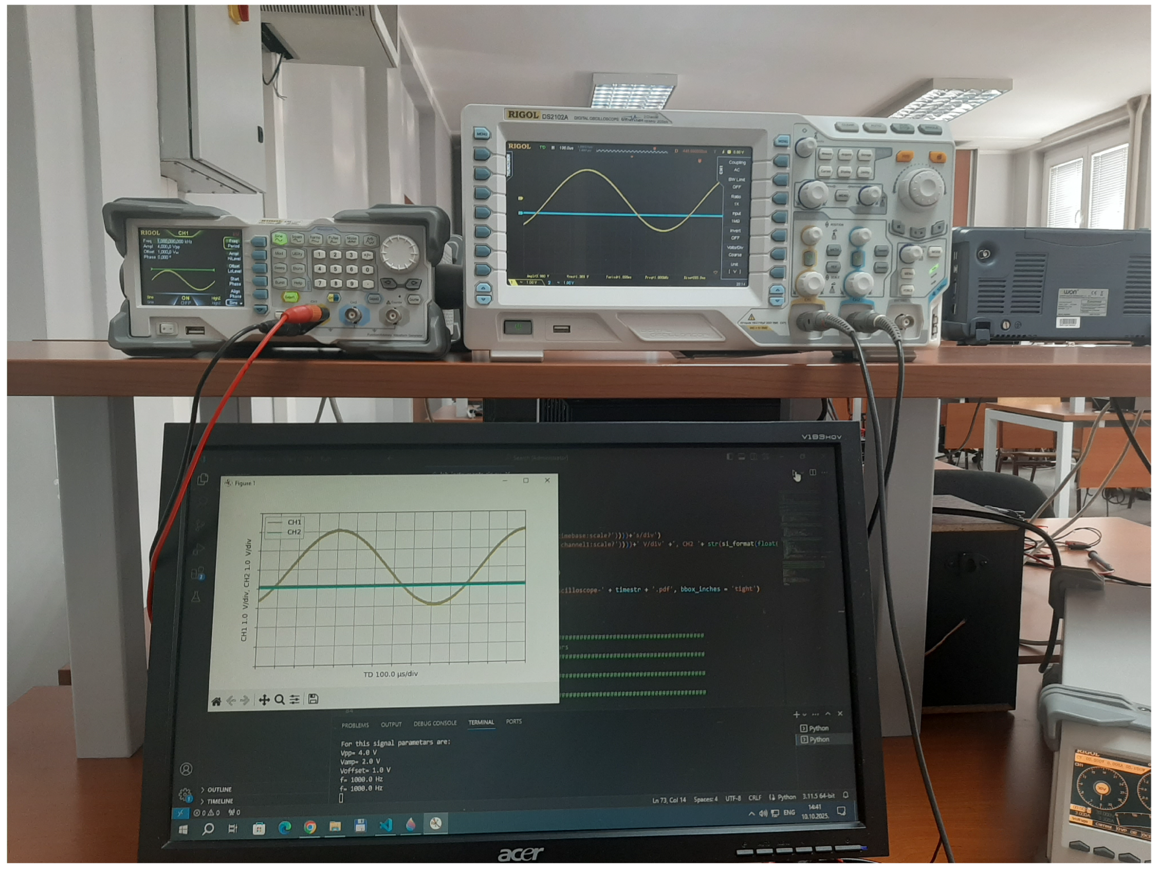 - Rigol Technologies, Inc. Rigol DS2102A Oscilloscope Programming Guide. Available online: https://beyondmeasure.rigoltech.com/acton/attachment/1579/f-0508/1/-/-/-/-/MSO2000A%26DS2000A_ProgrammingGuide.pdf (accessed on 21 October 2025).