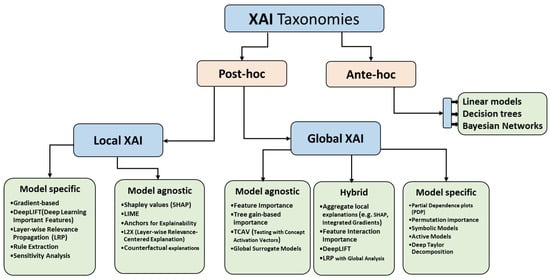 Comprehensive taxonomy of XAI methods categorized by interpretability approach (ante hoc vs. post hoc) and explanation scope (local vs. global), with specific techniques listed for each category.